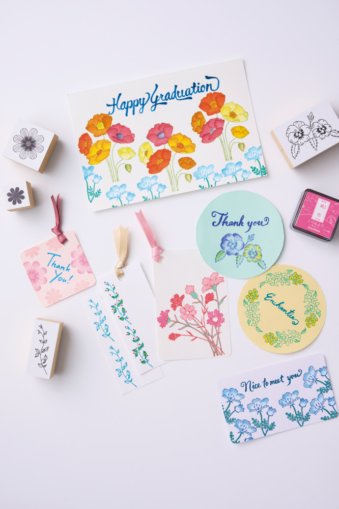 「いろもよう」などの油性顔料インキでスタンプした上から色を重ねても印影がにじまないので、スタンプアートをより華やかに仕上げることができます。ラインナップは「いろもよう」と同じ日本の伝統色から選定した29色のカラーペンと、濃淡のグラデーションや色の混色が楽しめる濃淡/混色用ペンを加えた全30種。さらに、組み合わせが特徴的な6色セットもご用意。