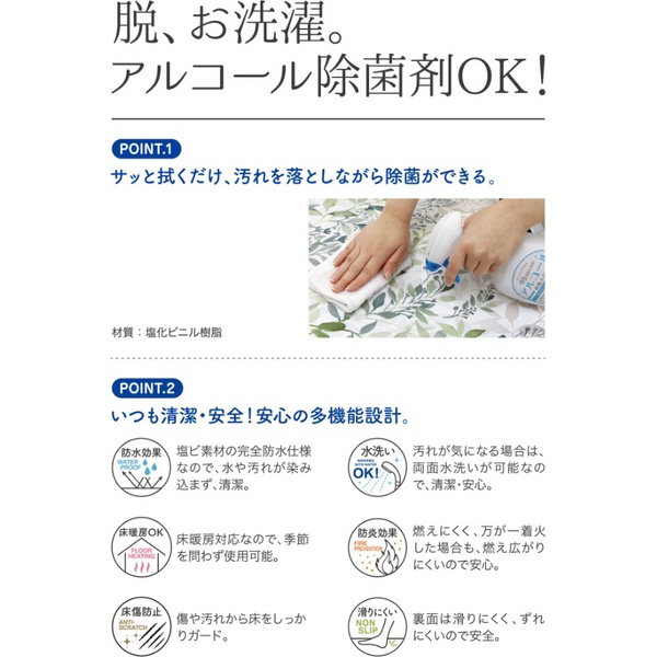 傷や汚れから床をしっかりガード。裏面は滑りにくく、ずれにくいので安全。床暖房対応なので、季節を問わずご使用可能です。