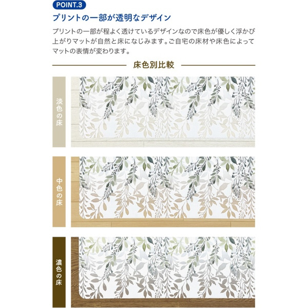プリントの一部が程よく透けているデザインなので床色が優しく浮かび上がりマットが自然と床になじみます。ご自宅の床材や床色によってマットの表情が変わります。