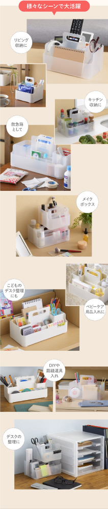 S、Mサイズは7部屋、Lサイズは8部屋に仕切られているので、細かく仕分けできます。ペンやハサミ、リモコンなど横に倒さずに立てて収納することができ、使いたいときにサッと取り出すことができます。