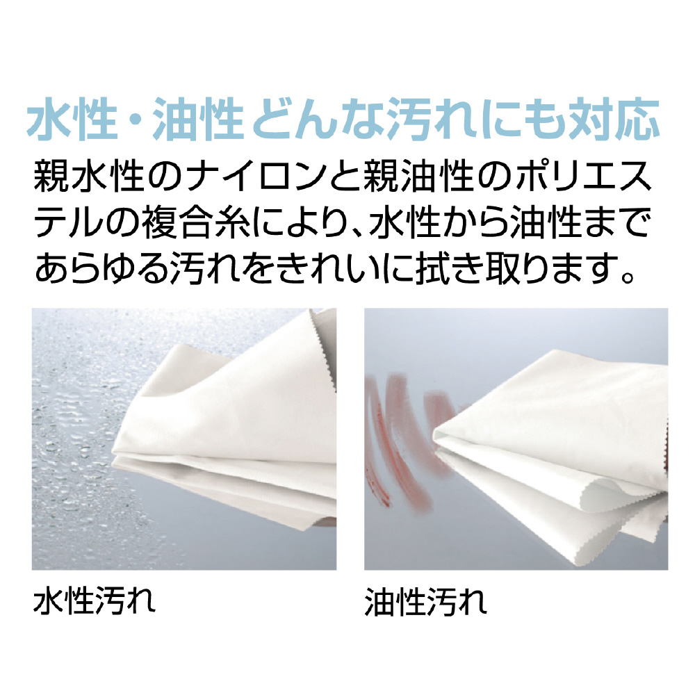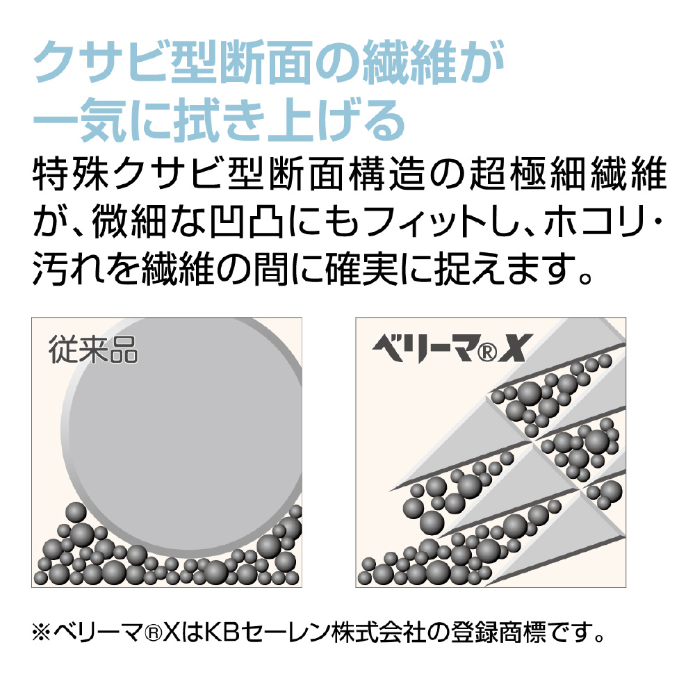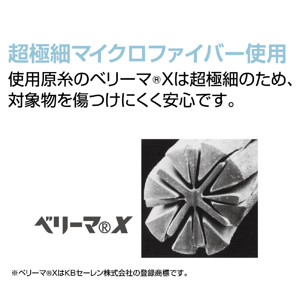 ●使用原糸の「ベリーマX」は超極細のため、対象物を傷つけにくく安心です。●親水性のナイロンと親油性のポリエステルの複合糸により、水性から油性まであらゆる汚れをきれいに拭き取ります。●特殊クサビ型断面構造の超極細繊維が、微細な凹凸にもフィットし、ホコリ・汚れを繊維の間に確実に捉えます。●水洗いができるので、洗って繰り返し使用可能です。