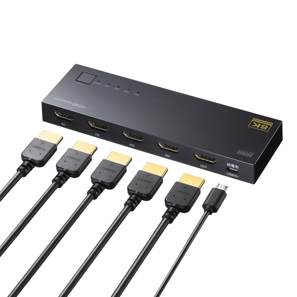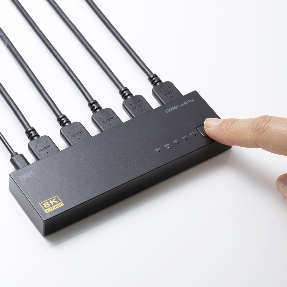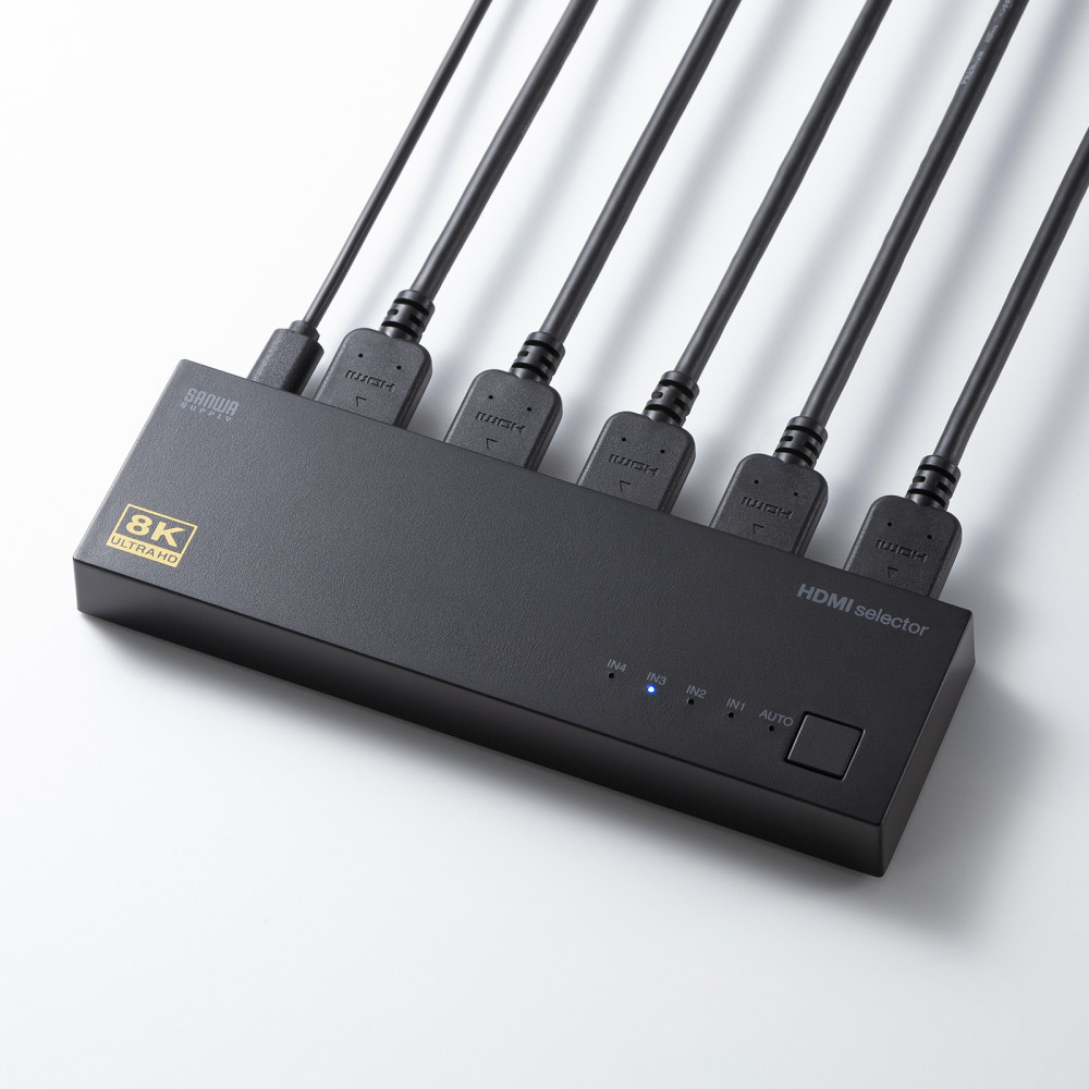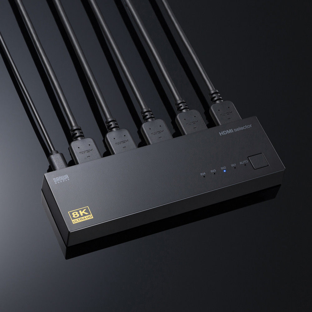 8K/60Hz、4K/120Hz映像に対応し超美麗な映像を楽しむことができる4入力1出力のHDMI切替器。自動切替/完全手動切替が選択可能。