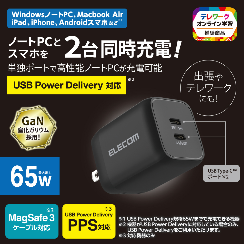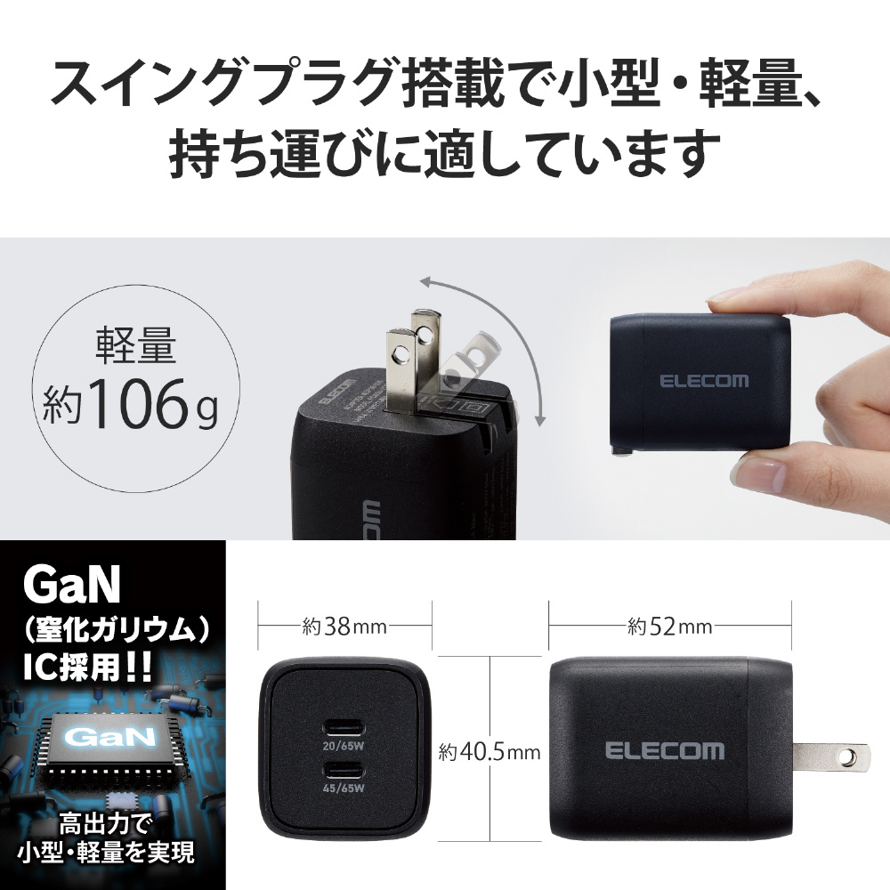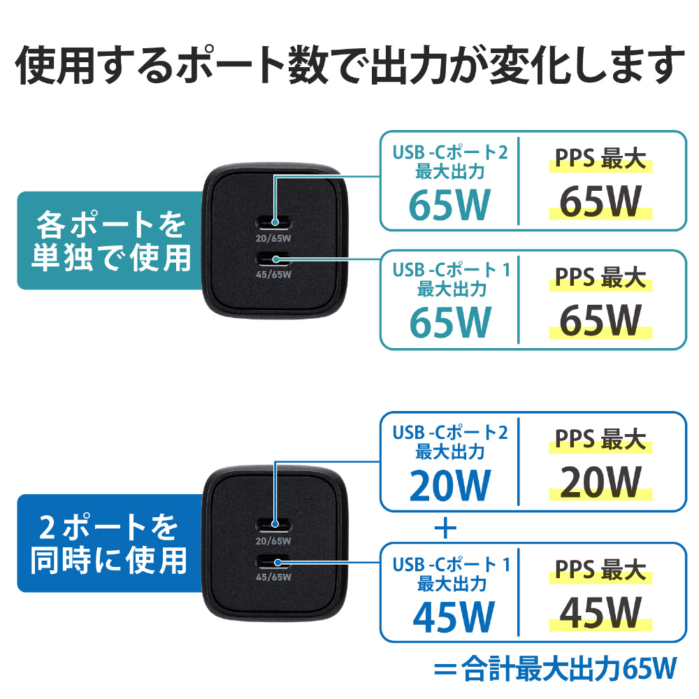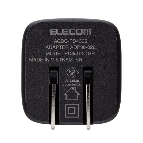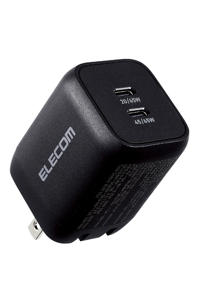 ノートパソコン 充電器 PD 65W PPS対応 Type-C ×2 折りたたみプラグ 小型 軽量 【 MacBook Pro / Air レノボ Dell HP NEC iPad iPhone Android ラップトップ タブレット スマホ 各種対応 】 ブラック ACDC-PD4365BK [2ポート /USB Power Delivery対応]