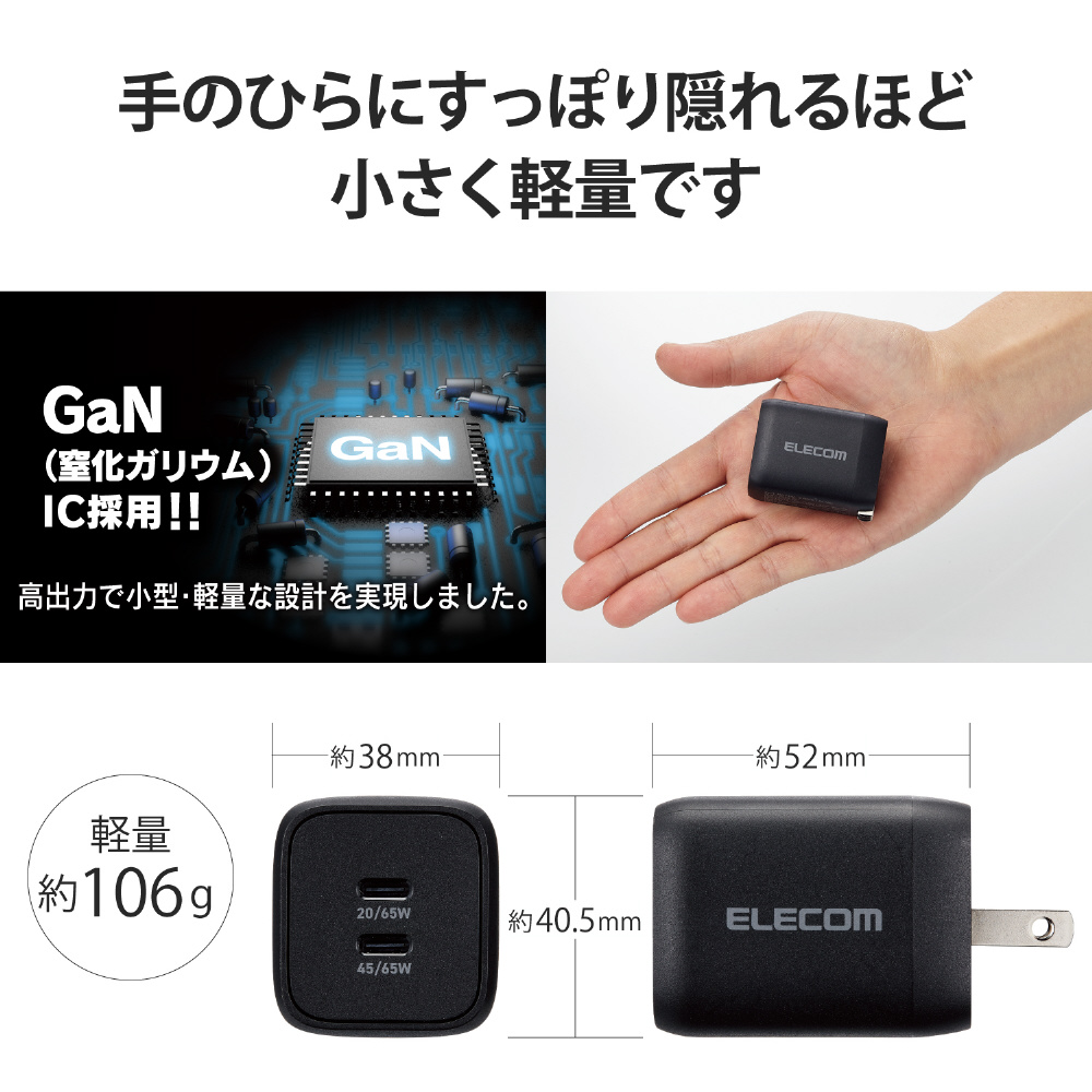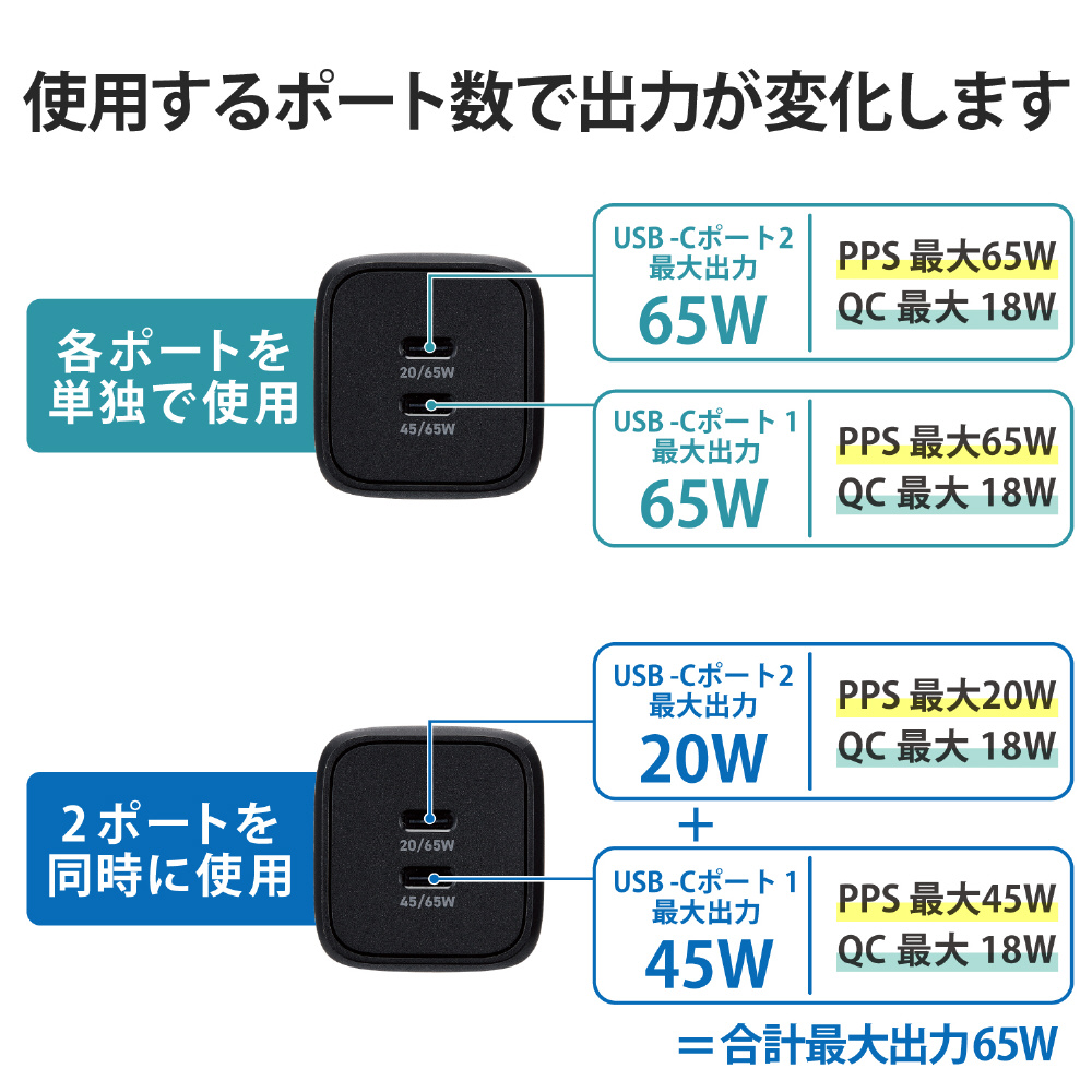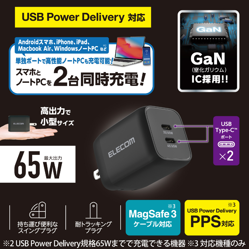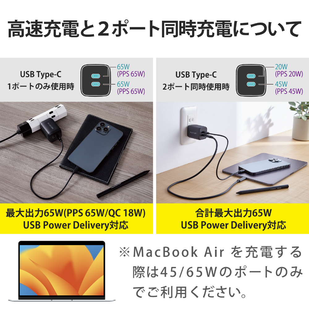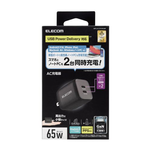 USB Type-C 充電器 PD PPS対応 合計出力 65W Type C×2 折りたたみプラグ 小型 軽量【 MacBook Pro / Air iPad iPhone Galaxy Xperia AQUOS OPPO Android Nintendo Switch 等対応 】 ブラック MPA-ACCP4365BK