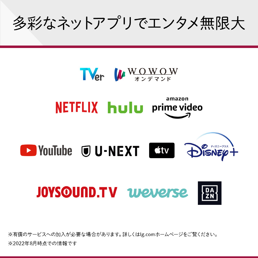 「観たい」にこたえる多彩なネット動画アプリに対応。幅広いジャンルのネット動画アプリがLGのテレビでも楽しめて、4K動画にも対応します。
