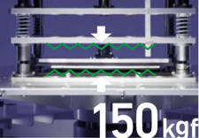 加圧振動試験の目的は、大きな圧力と振動がかかった状態でも壊れないタフさを実現すること。例えば、通勤ラッシュ時には、鞄に入れたPCが天板方向、底面方向の双方から強く押されるため、液晶ディスプレイやキーボードなどにサンドイッチ状の圧力がかかります。加圧振動試験では、万力と同じ原理の装置で、VAIOに150kgf*もの大きな圧力を加えます。そして、それをそのまま振動試験機に固定し、圧力と振動を与え続けた状態でもVAIOが正常に動作するかを確認します