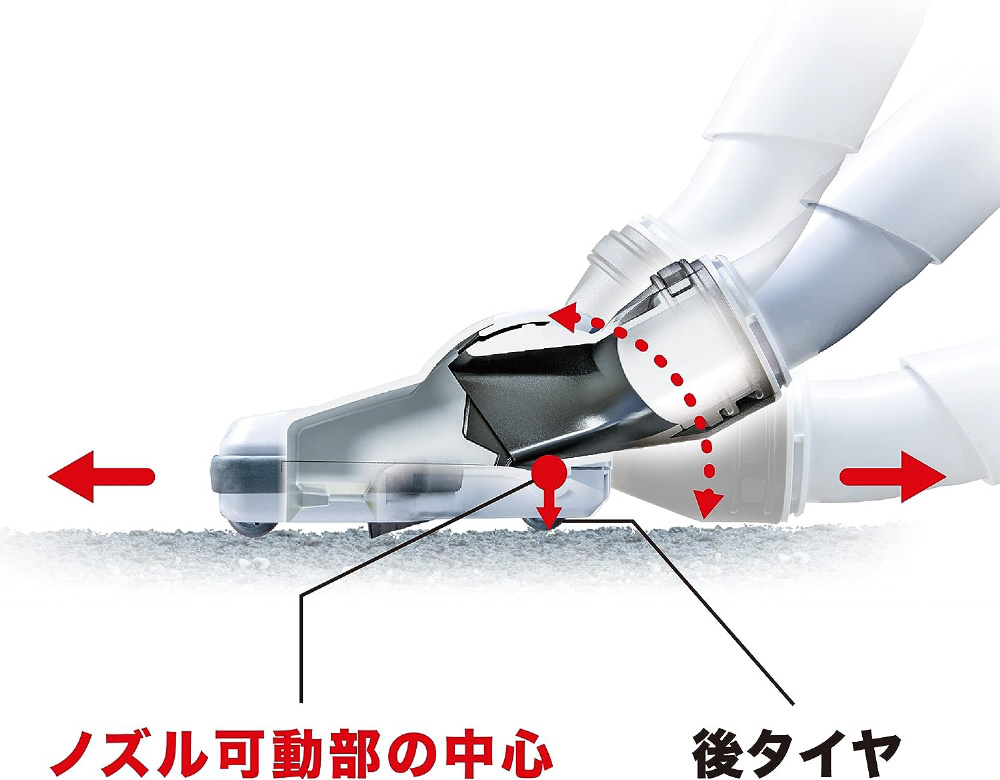 滑るような操作性。ノズル可動部の中心を後タイヤ軸上に配置。じゅうたん等への引っ掛かりを低減。