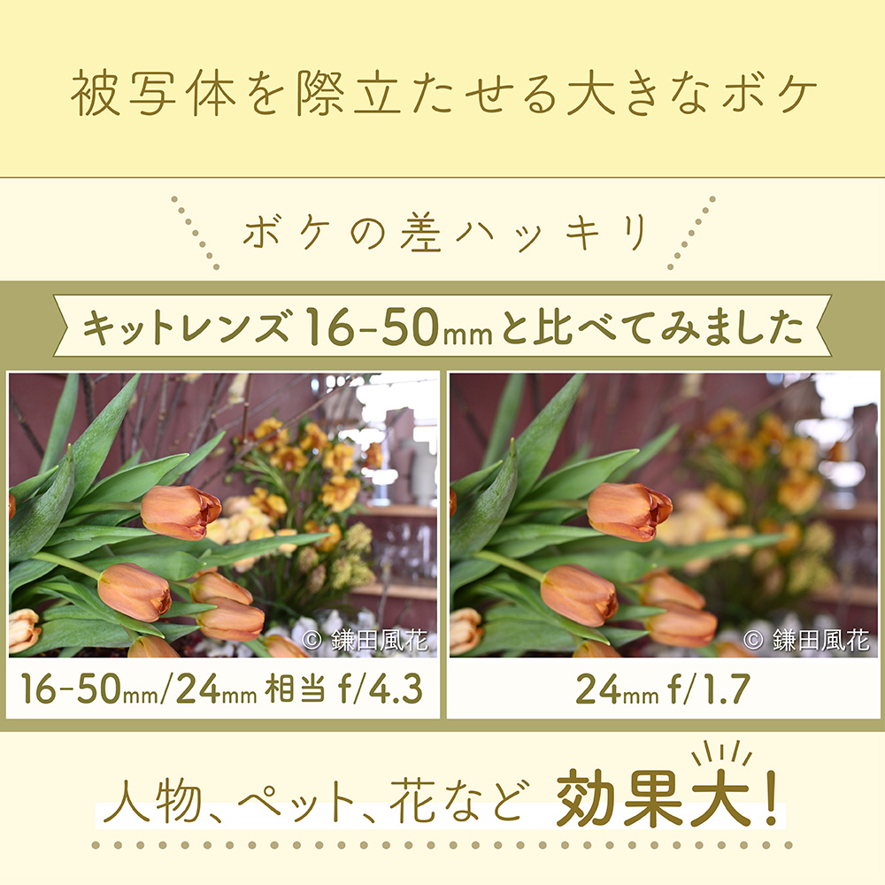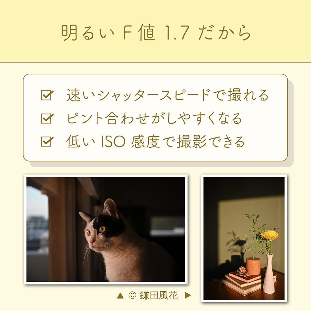 明るい開放F値1.7により、背景を大きくぼかして被写体を際立たせることができ、見る人の目を主役に惹きつけます。