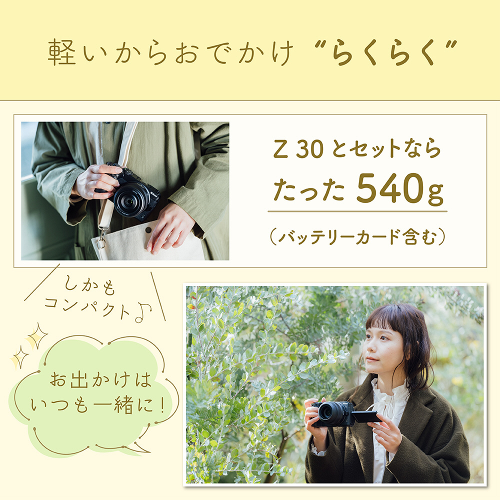 約135gの小型・軽量設計です。コンパクトなZ 30と組み合わせると約540gの軽さ。旅行やちょっとした外出などにも、気軽にカメラを持ち出せます。
