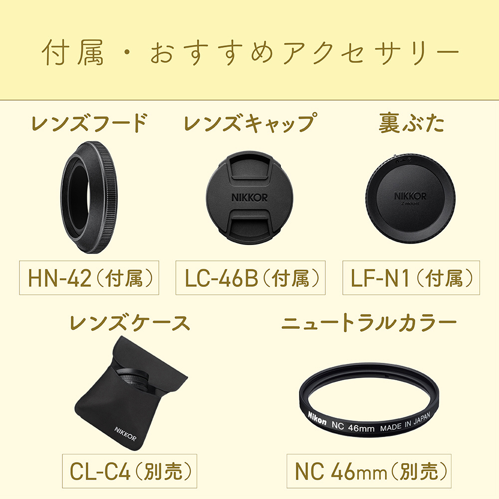 | 付属品 | レンズキャップ LC-46B、レンズキャップ LF-N1、レンズフード HN-42 |