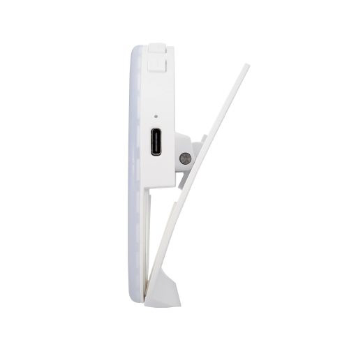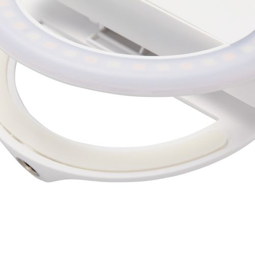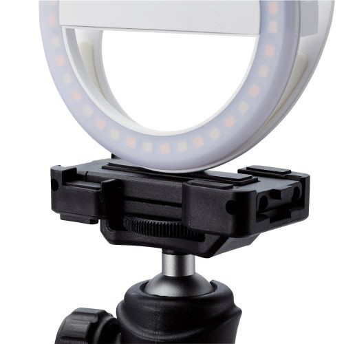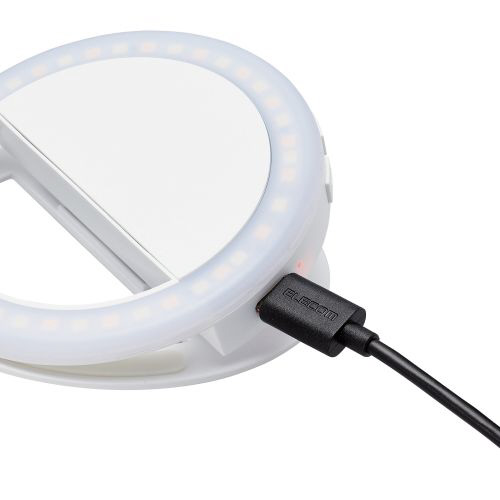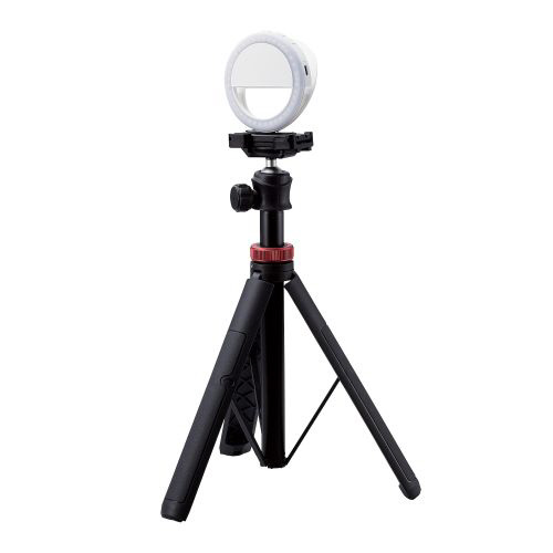 スマートフォンやノートパソコンなどに挟み込んで固定できる、クリップ式タイプのリングライトです。動画配信・オンライン会議・オンライン学習・Web面接などでも使用できます。直径約9cm、重量約54gの軽量コンパクトタイプで、バッテリーを搭載しているため電源のない場所でも使用できます。1/4インチネジ穴を搭載し、三脚への取り付けも可能です。電球色、昼光色、昼白色の3色の切り替えができ、3段階の明るさ調整も可能です。