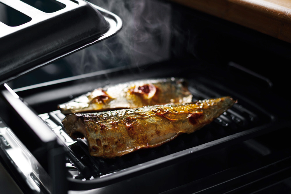 ・グリルの引き出し幅が従来から7.3cm増えて、食材の出し入れが簡単になりました。しかも、グリルがスムーズに引き出せます