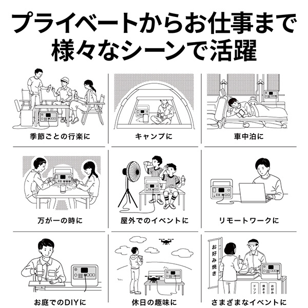 • ポータブル電源は、車中泊におすすめです。車内環境を快適・安全にすることができます。電気ケトルや小型のIHコンロなど、車内で火を使わずに調理をすることができたり、冬には電気毛布、夏には扇風機など、車内の温度調整にも大きく役に立ちます。車内で調理家電を使用する場合などは定格出力が1,000Wh以上、容量も1,000Wh以上のものがおすすめです。