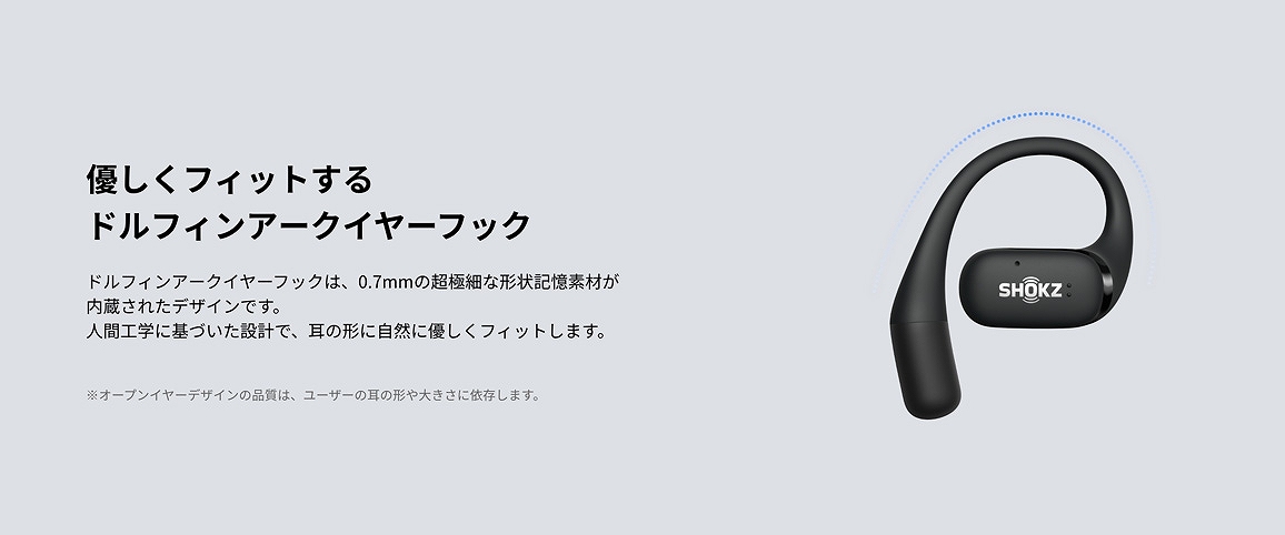 ドルフィンアークイヤーフックは、0.7mmの超極細な形状記憶素材が内蔵されたデザインです。人間工学に基づいた設計で、耳の形に自然に優しくフィットします。