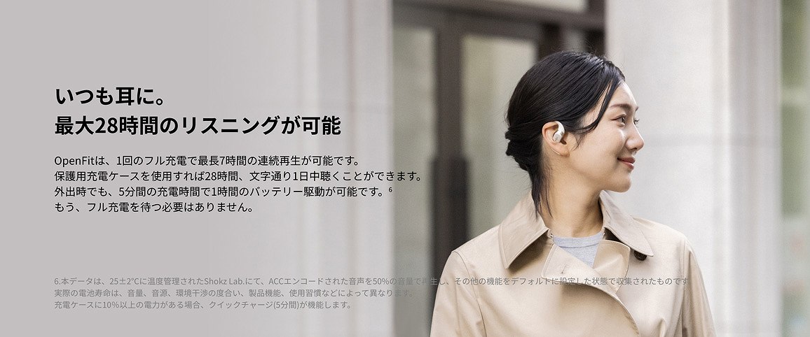 OpenFitは、1回のフル充電で最長7時間の連続再生が可能です。保護用充電ケースを使用すれば28時間、文字通り1日中聴くことができます。外出時でも、5分間の充電時間で1時間のバッテリー駆動が可能です。もう、フル充電を待つ必要はありません。