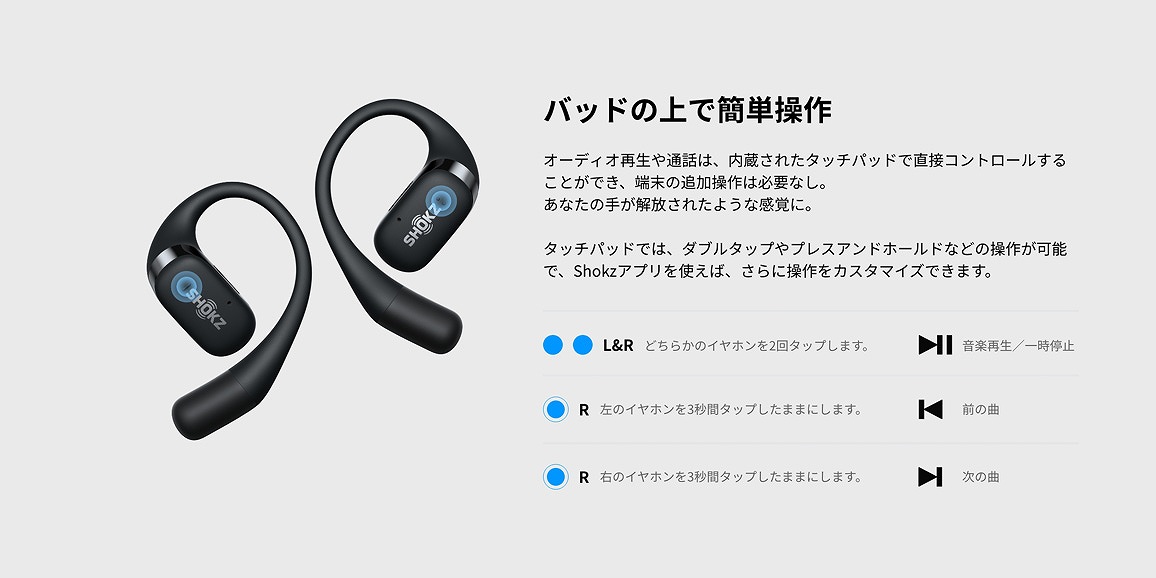 オーディオ再生や通話は、内蔵されたタッチパッドで直接コントロールすることができ、端末の追加操作は必要なし。あなたの手が解放されたような感覚に。タッチパッドでは、ダブルタップやプレスアンドホールドなどの操作が可能で、Shokzアプリを使えば、さらに操作をカスタマイズできます。