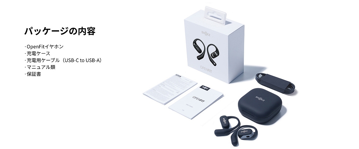 | 付属品 | 充電ケース、充電用ケーブル(USB-C to USB-A)、マニュアル類、保証書 |