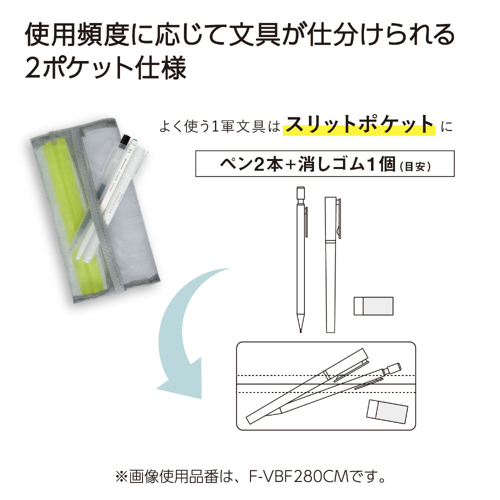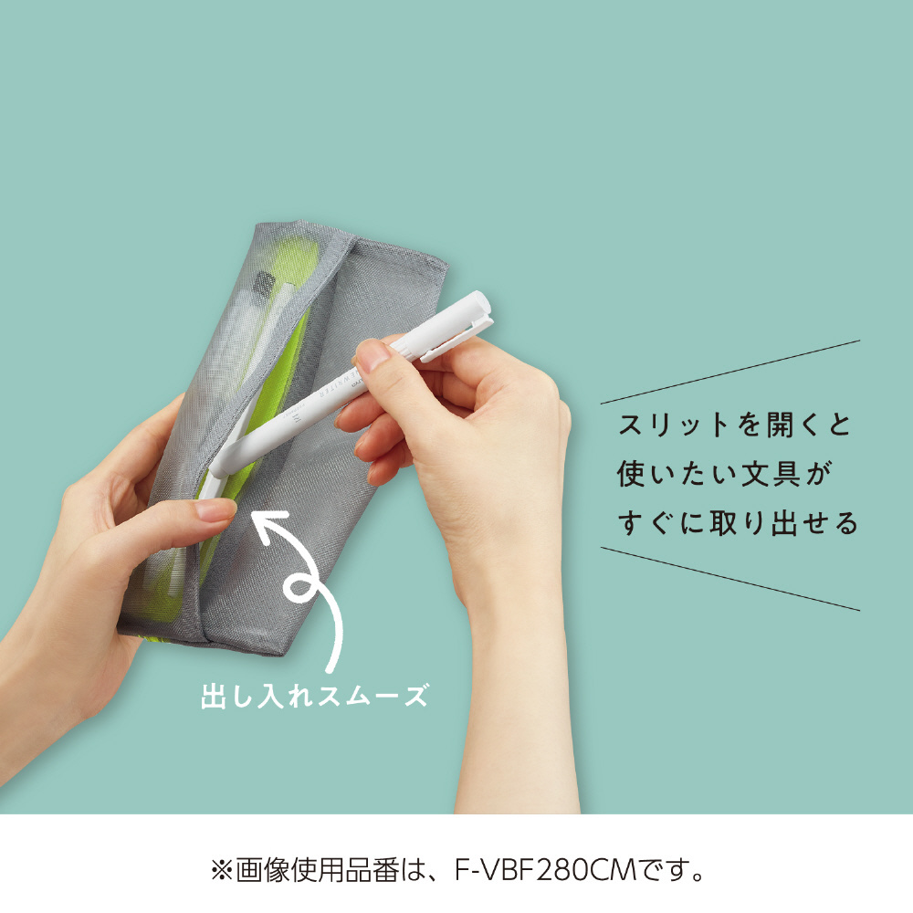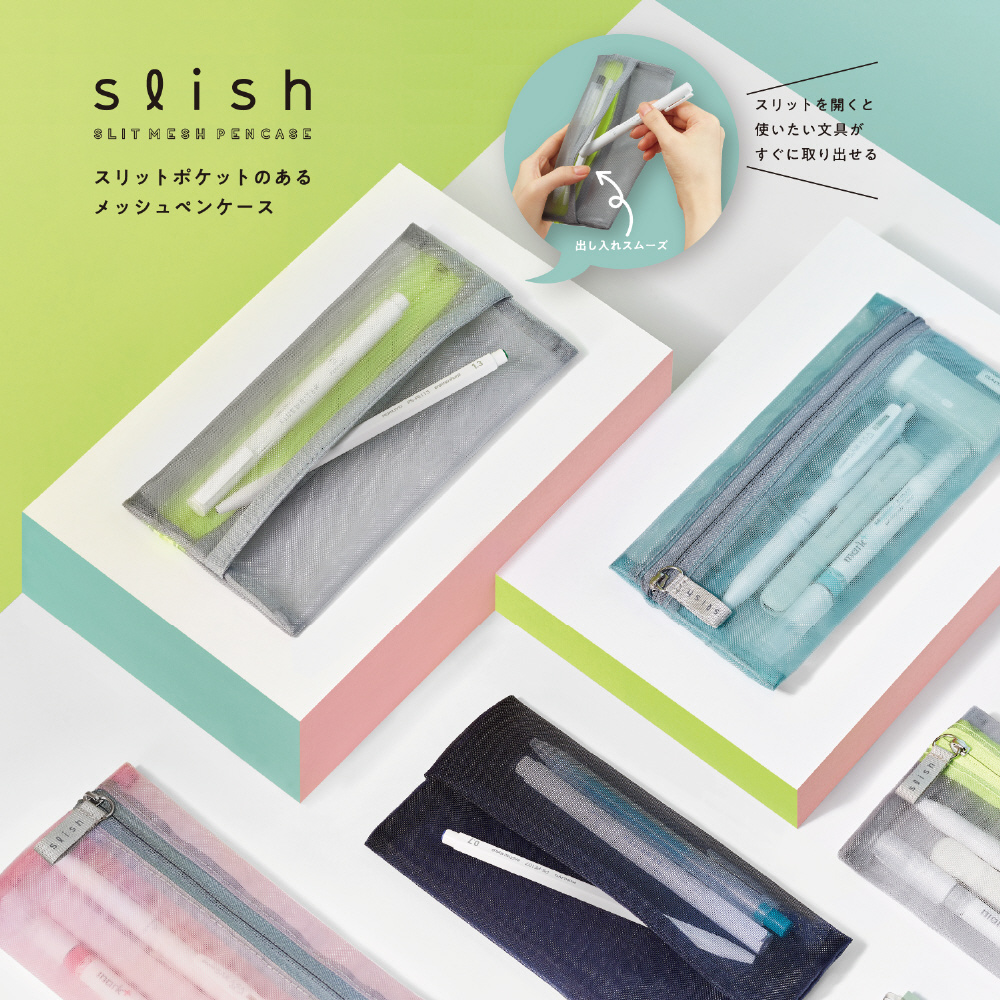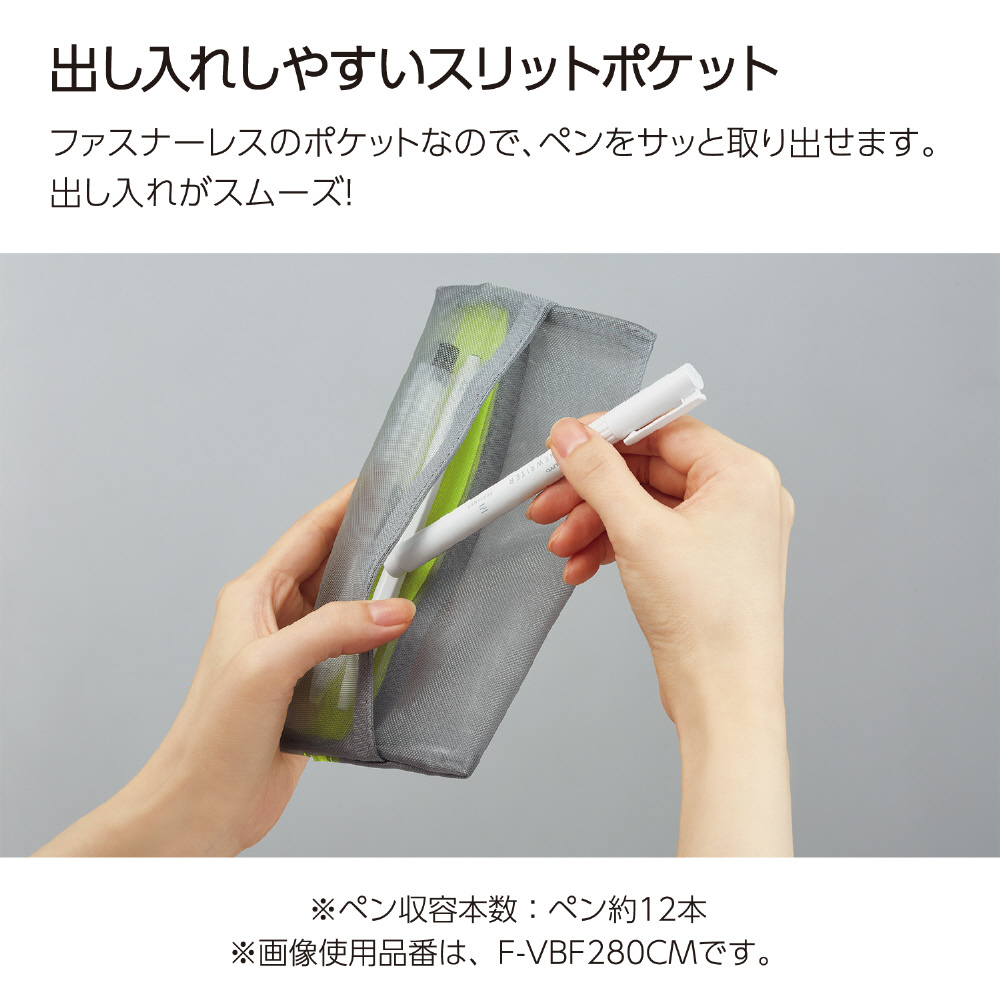 スリットポケットで出し入れスムーズ。メッシュペンケース。