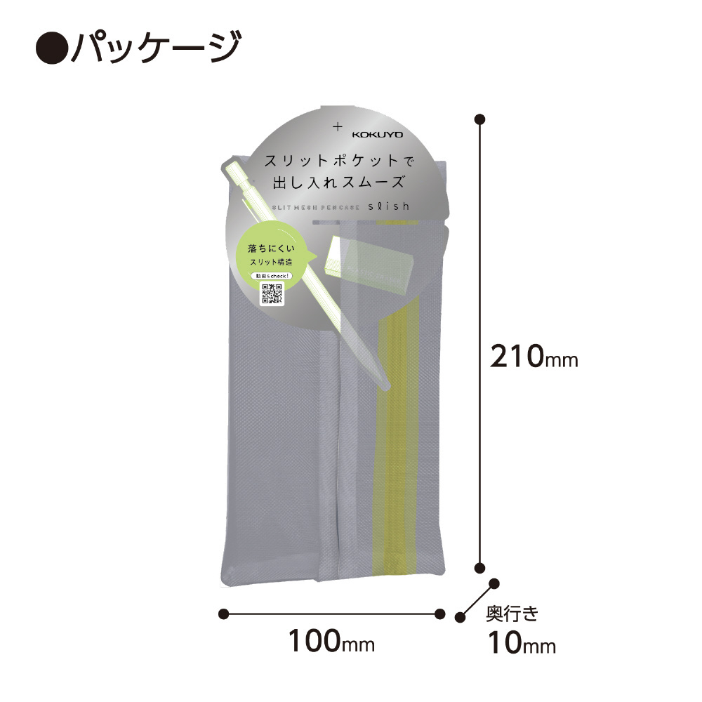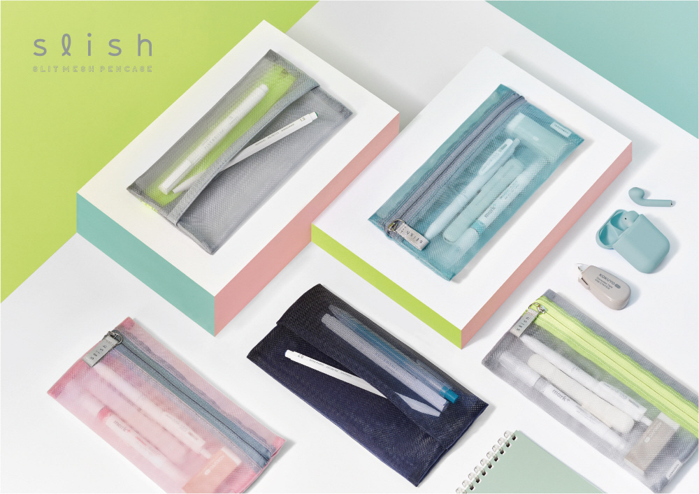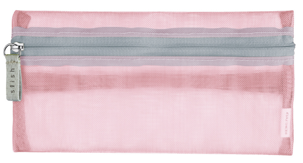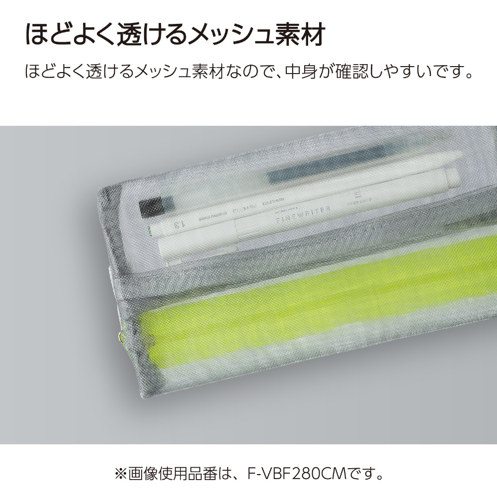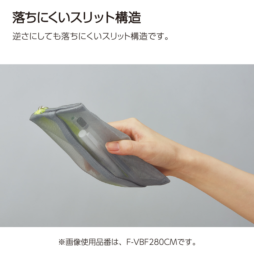 スリットポケットで出し入れスムーズ。メッシュペンケース。