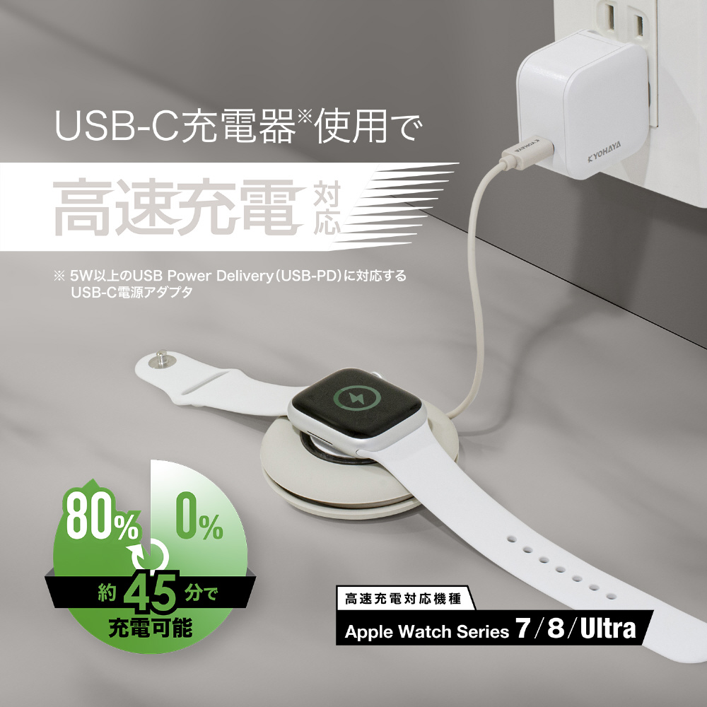 高速充電AppleWatchSeries7/8/Ultraでは高速充電に対応。ケーブルをスッキリ収納できるので持ち運びに最適。
