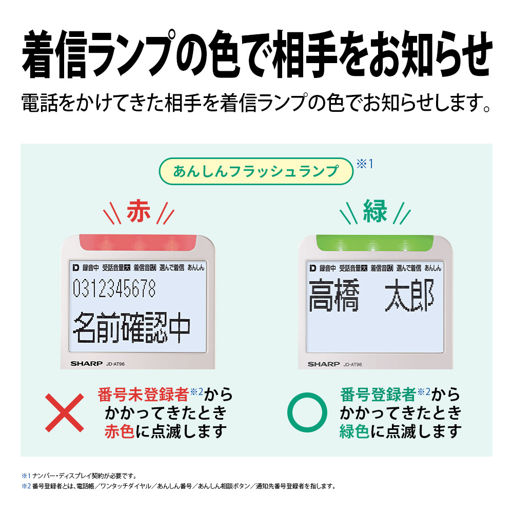 知人(番号登録者)からの電話は緑色、それ以外の人(登録者以外)からの電話は赤色にフラッシュランプが点滅。ご高齢の方や小さなお子様にもわかりやすく表示します。