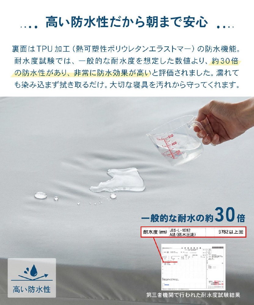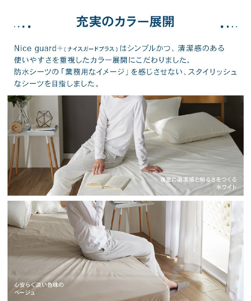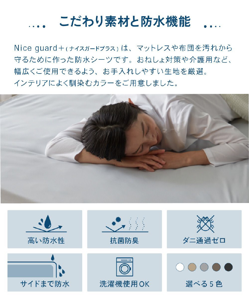 こだわりの素材と防水機能。Nice guard+は、マットレスや布団を汚れから守るために作った防水シーツです。