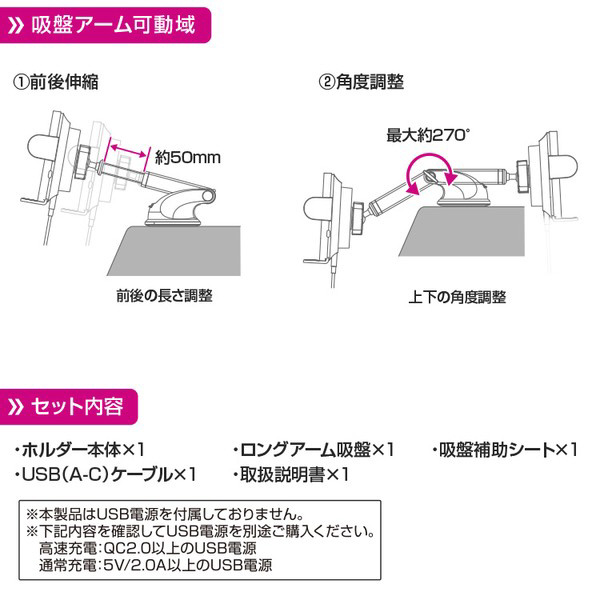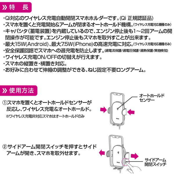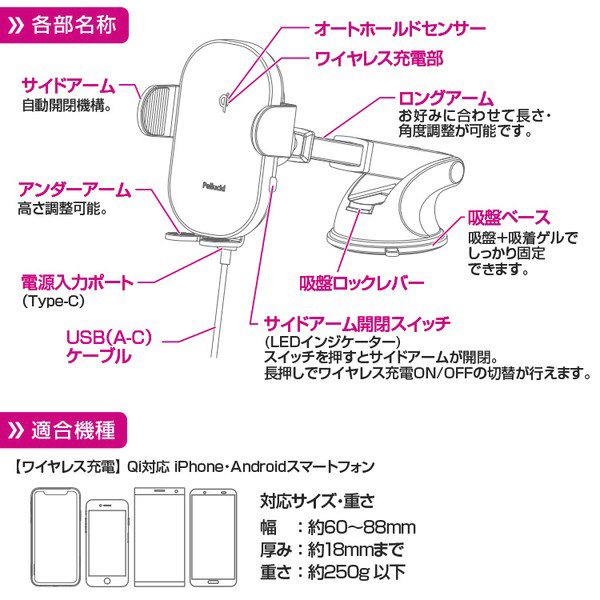 PPH2308 車内用品 スマホホルダー 自動開閉ロングアーム 吸盤貼付けタイプ 対応サイズ:(幅):約60〜88mm/厚み:約18mmまで/重さ:約250g以下 ワイヤレス充電:最大15W (iPhone:7.5W) PPH2308