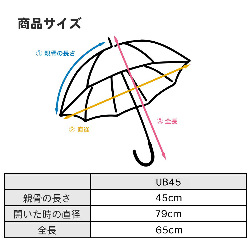 | サイズ | 傘骨の長さ:45cm 開いた時の傘の直径:79cm 畳んだ状態での全長:65cm |