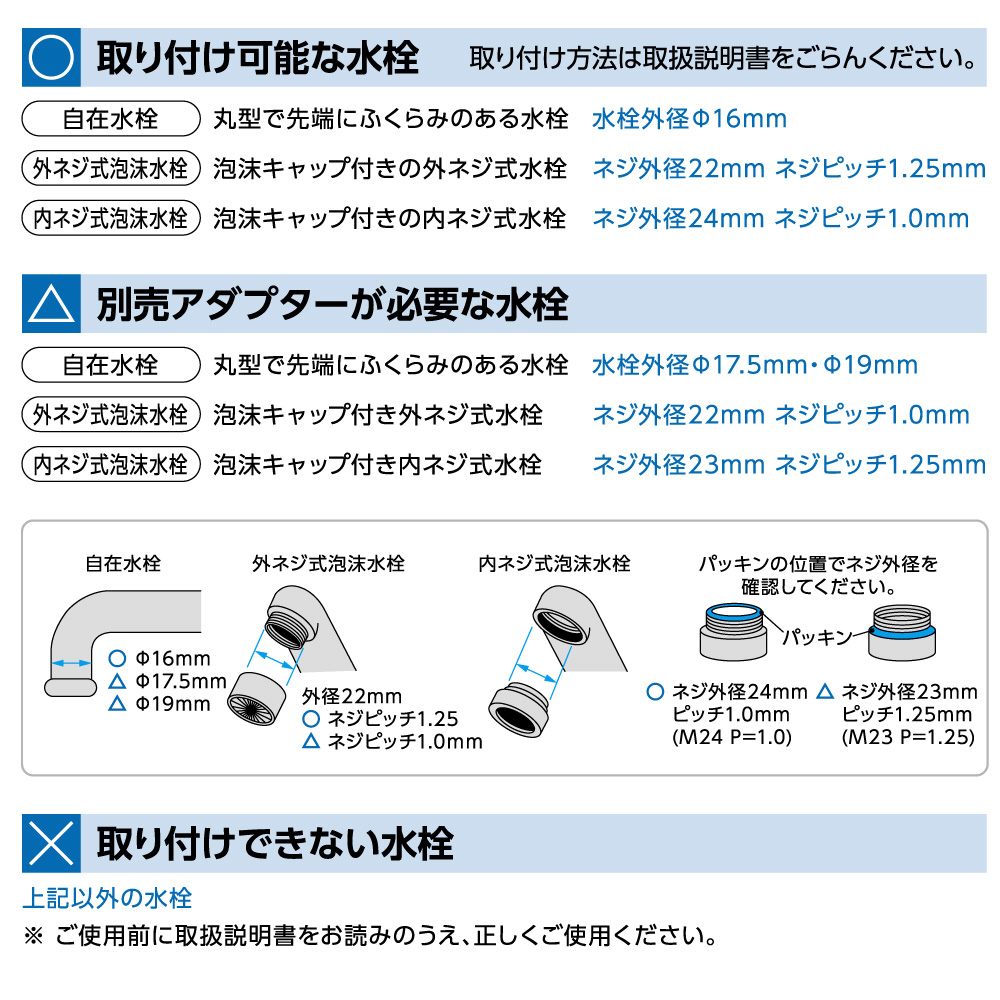 | 仕様2 | 取り付け可能水栓:自在水栓(16mm)、泡沫水栓(外ネジ式)、泡沫水栓(内ネジ式) |