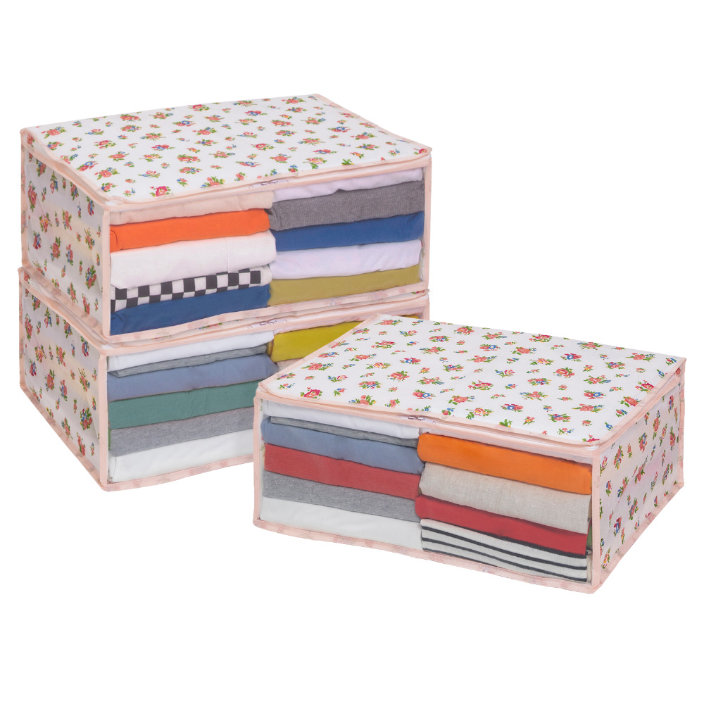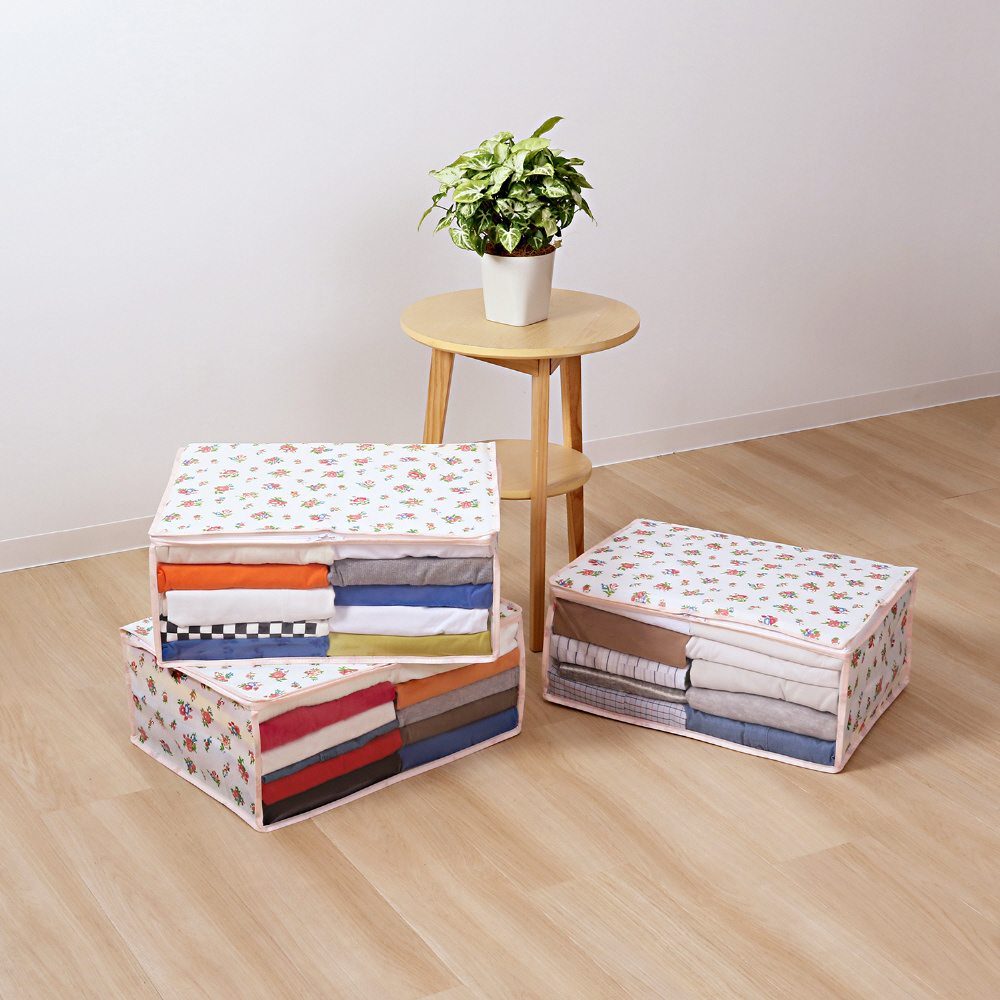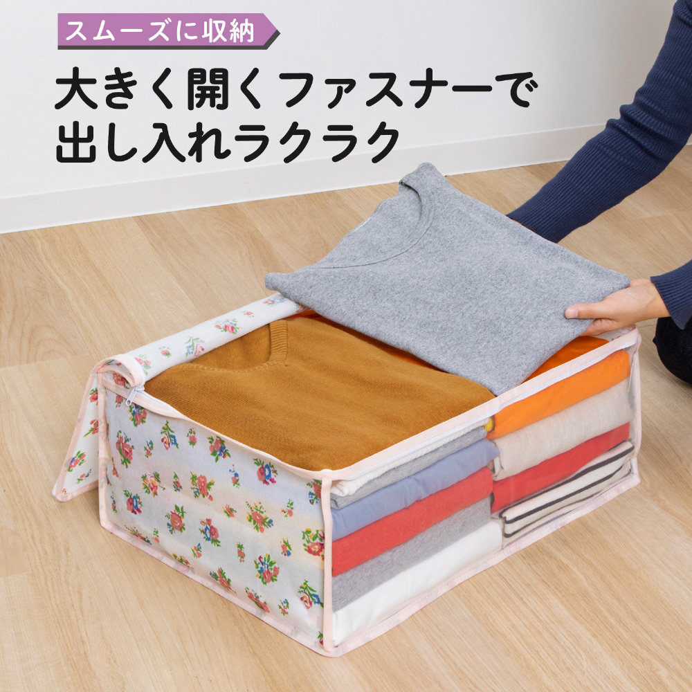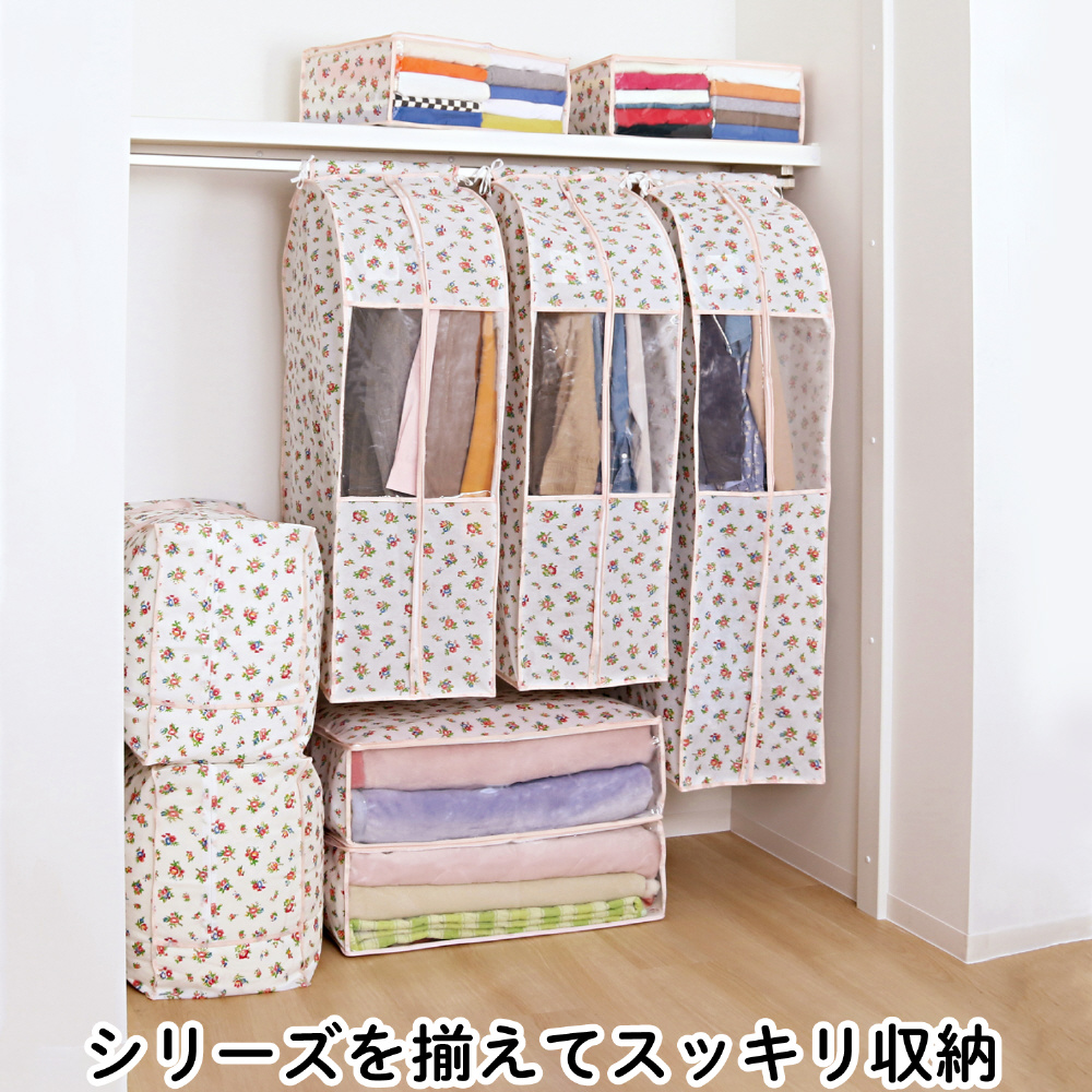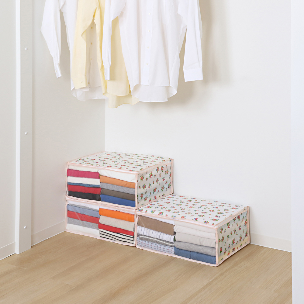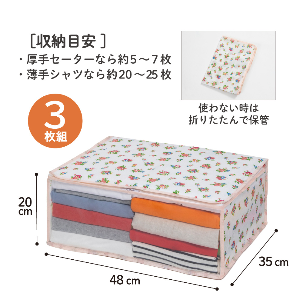 【商品仕様】:サイズ/約幅48×奥行35×高さ20cm、カラー/ホワイト、柄/プチローズ柄、内容/3個、収納目安(1個あたり)/厚手セーターなら約5〜7枚・薄手シャツなら約20〜25枚、材質/ポリプロピレン・ポリエチレン