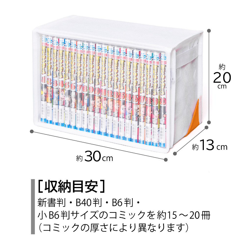 【商品仕様】:サイズ/約幅30×奥行13×高さ20cm、カラー/ホワイト、内容/3個、適応サイズ/B6判(約13×18cm)・新書判(約10×18cm)・小B6判(約11×17cm)・B40判(約10~11×17~18cm)サイズ、収納目安(1ケースあたり)/B6判・新書判・小B6判・B40判サイズの本:約15~20冊、材質/ポリプロピレン・ポリエチレン