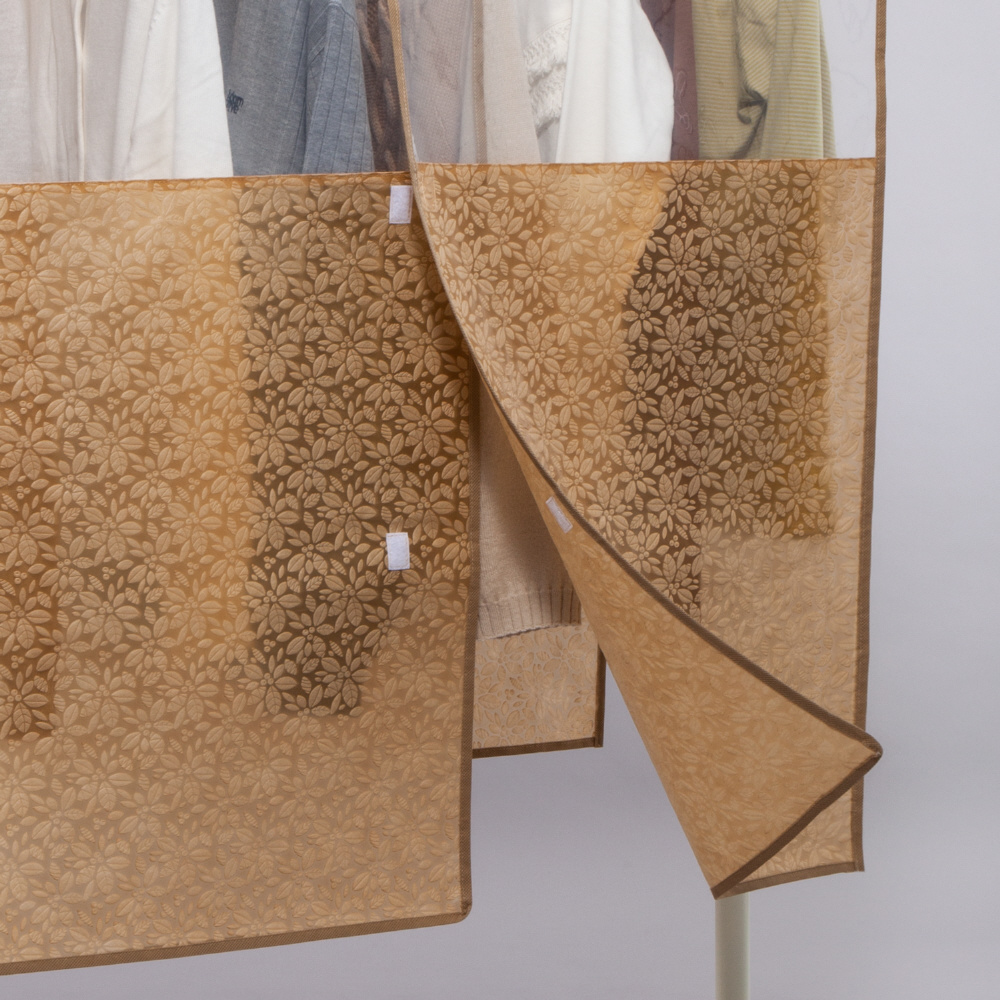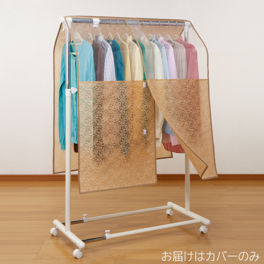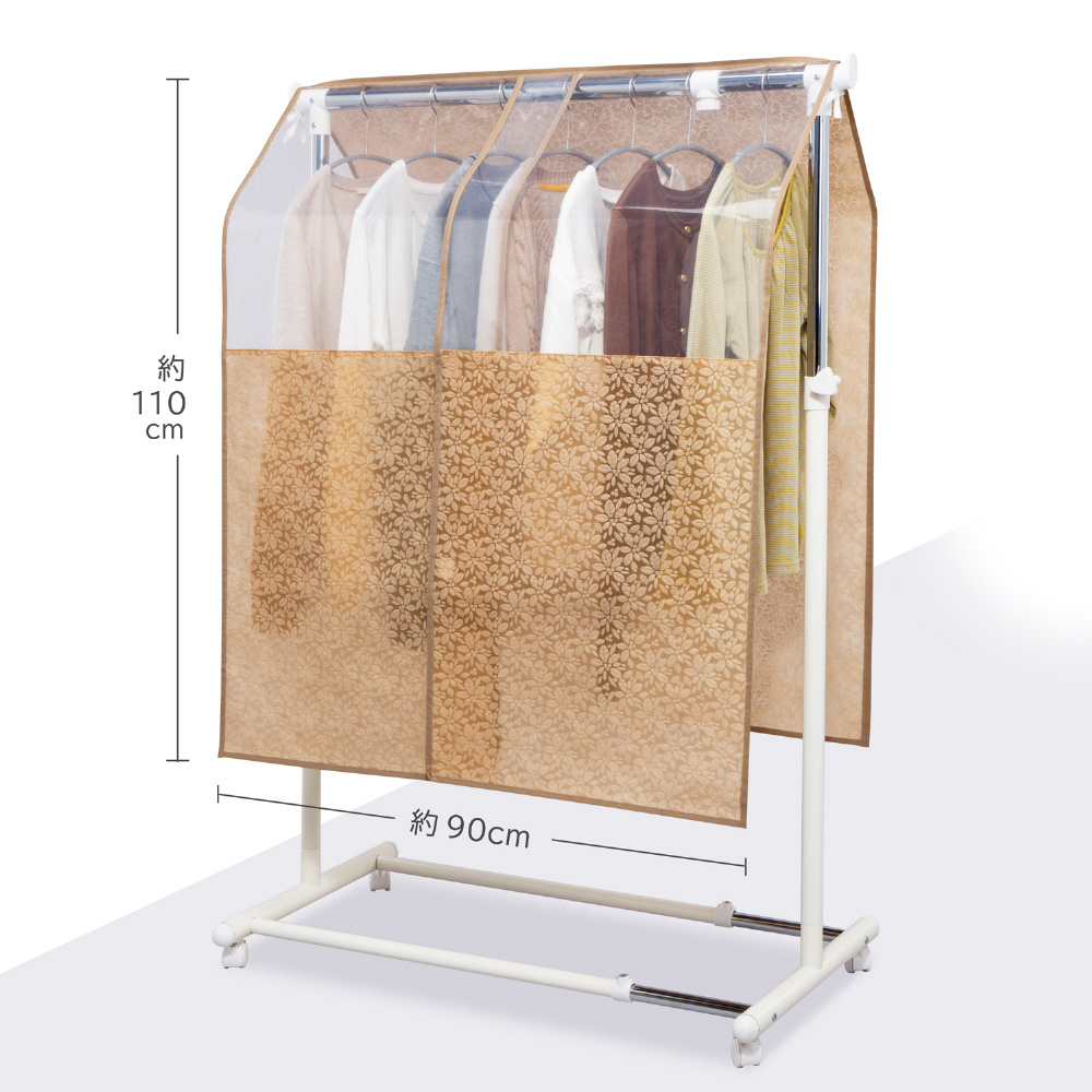 【商品仕様】:サイズ/約幅90×高さ110cm、内容/1枚、カラー/ブラウン、柄/ボタニカル柄、適用サイズ/幅90cmのハンガーラック、材質/ポリプロピレン・ポリエチレン