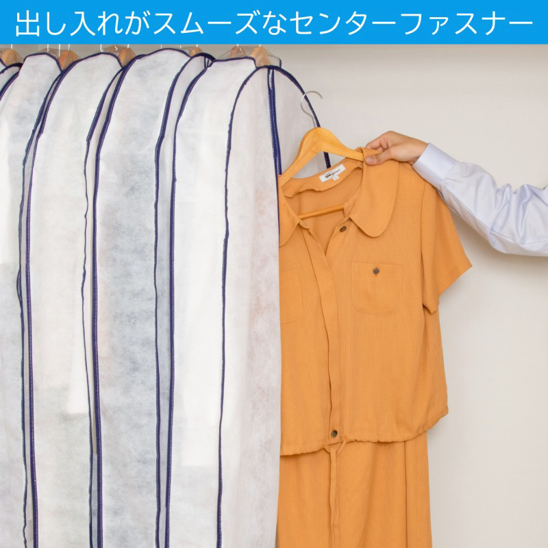 大きく開いて出し入れしやすいセンターファスナー。ハンガーに掛けたまま衣類の出し入れができる。
