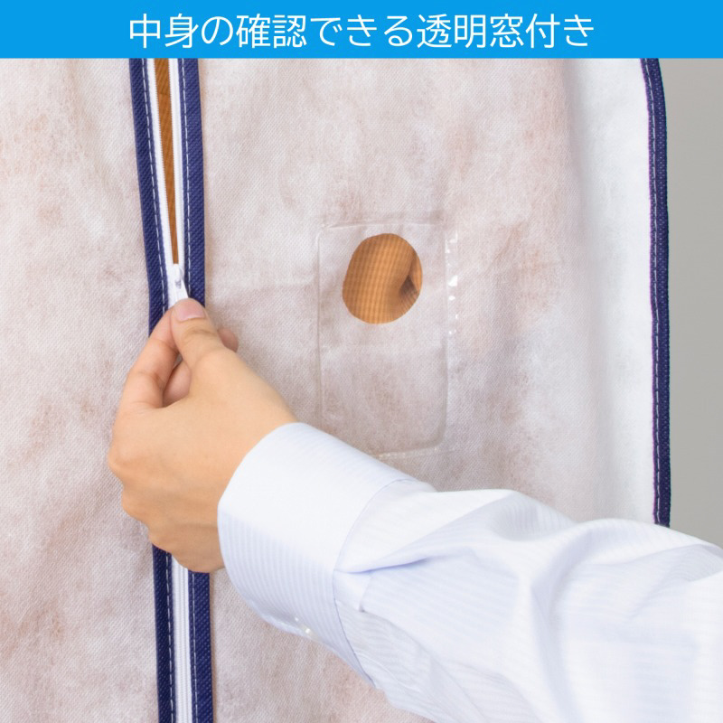 中身の見える透明窓と防虫剤用ポケット付き。透明の防虫剤用ポケットなので取り替えサインが一目で分かる。ネームホルダーとして中の衣類のメモを入れてもOK。
