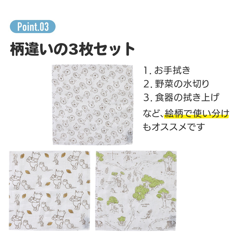 かわいいキャラクター柄のかや生地のふきん3枚セット。吸水性にすぐれた綿100%。色違いの3枚セットです。※洗濯機、乾燥機の使用はお避け下さい。※洗濯の際は手洗いしてください。
