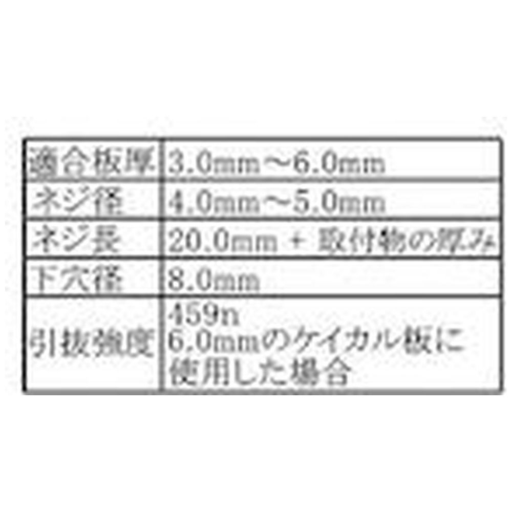 ・サイズ: TA適合壁厚(mm): 3.0〜6.0使用ねじ径(mm): 4.0〜5.0ねじ長(mm): 20.0+取付物の厚み下穴径(mm): 8