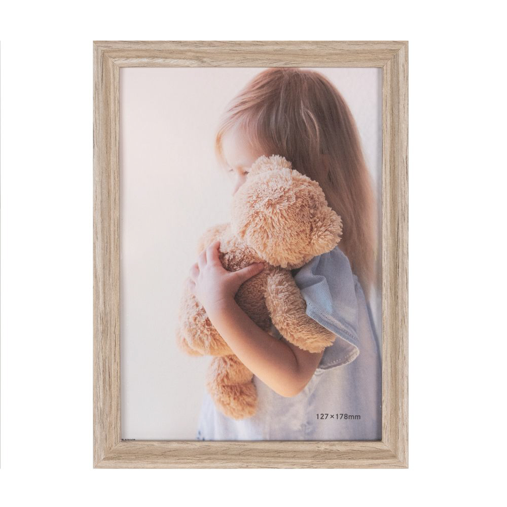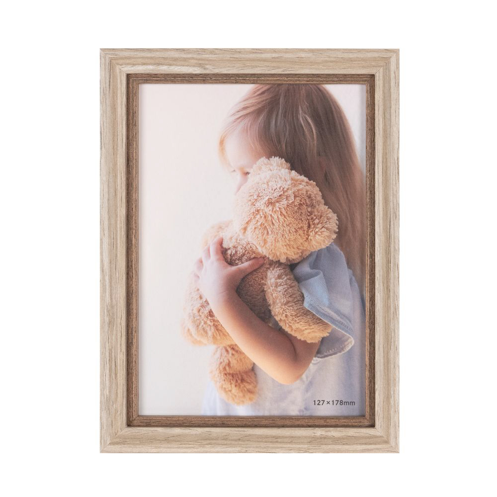 インナーカラーとナチュラルな木目調のツートンカラーがかわいいフォトフレーム 。ガラスと写真の間が空いているため、ガラスに写真が貼りつきません。また、インナーフレームは取り外し可能です。