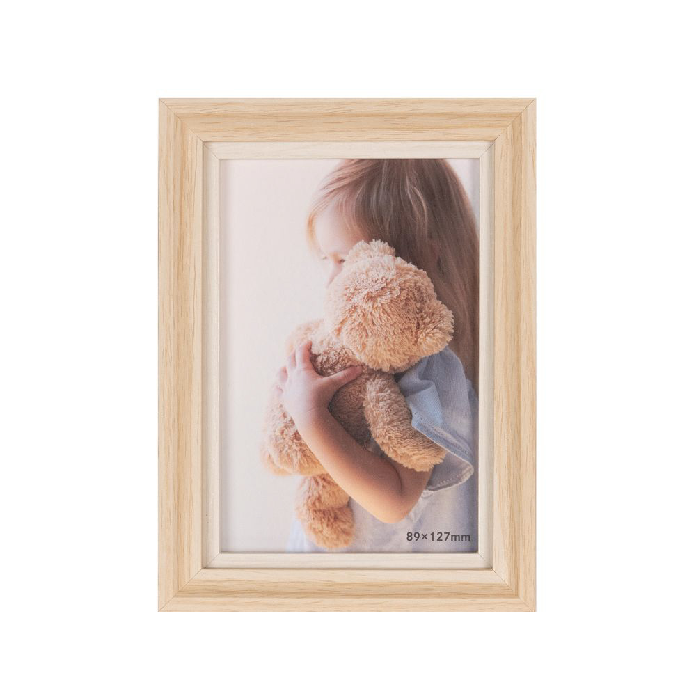 インナーカラーとナチュラルな木目調のツートンカラーがかわいいフォトフレーム 。ガラスと写真の間が空いているため、ガラスに写真が貼りつきません。また、インナーフレームは取り外し可能です。