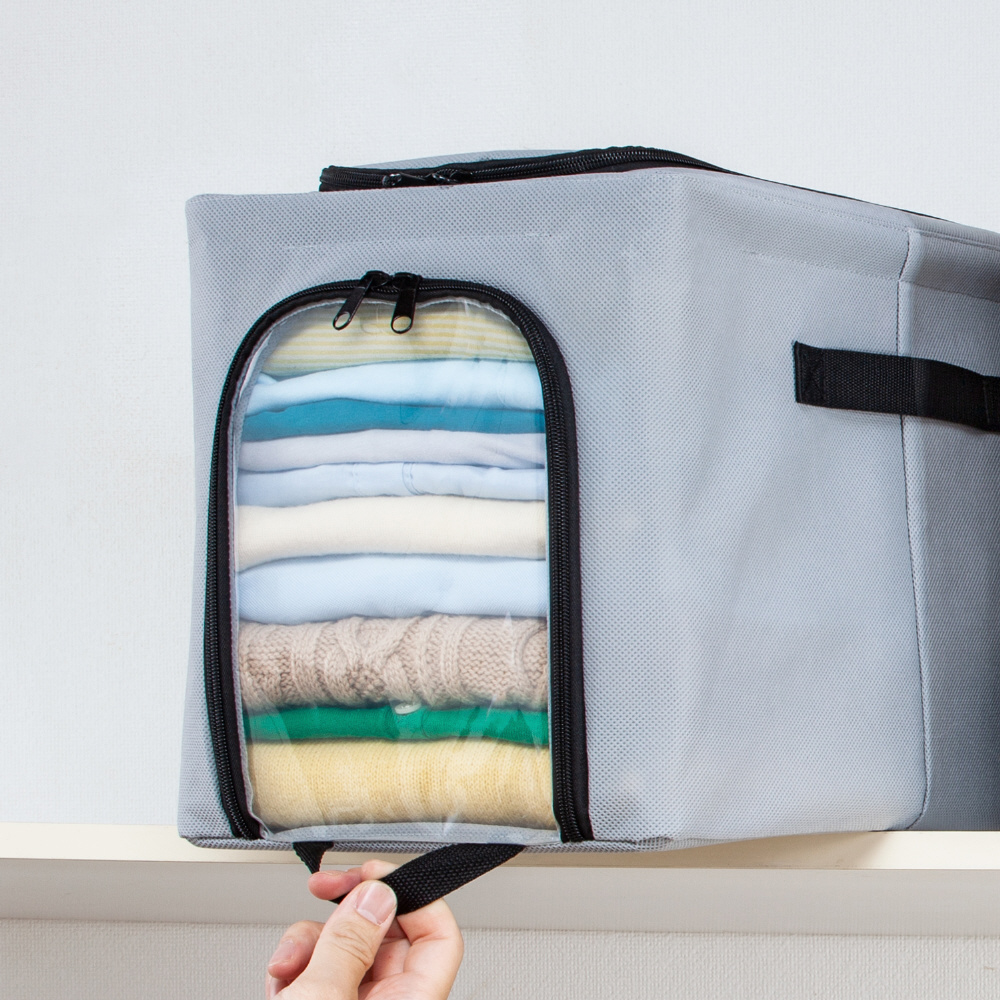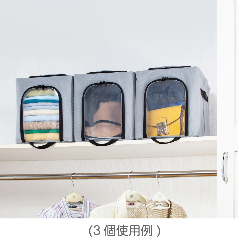 【持ち手付き・折りたためる】:両サイドと手前に持ち手が付いているので、高いところに保管してもラクラク取り出せる。使わないときはスリムに。