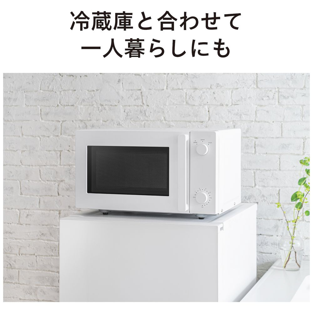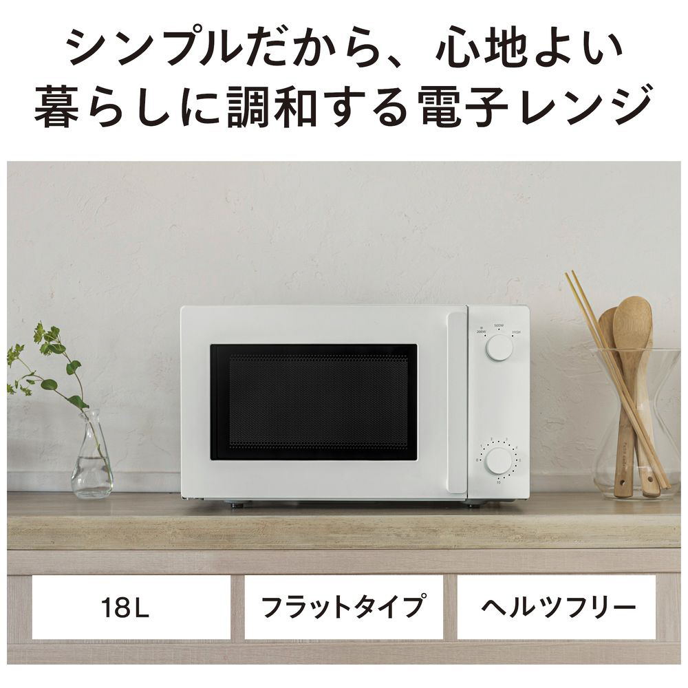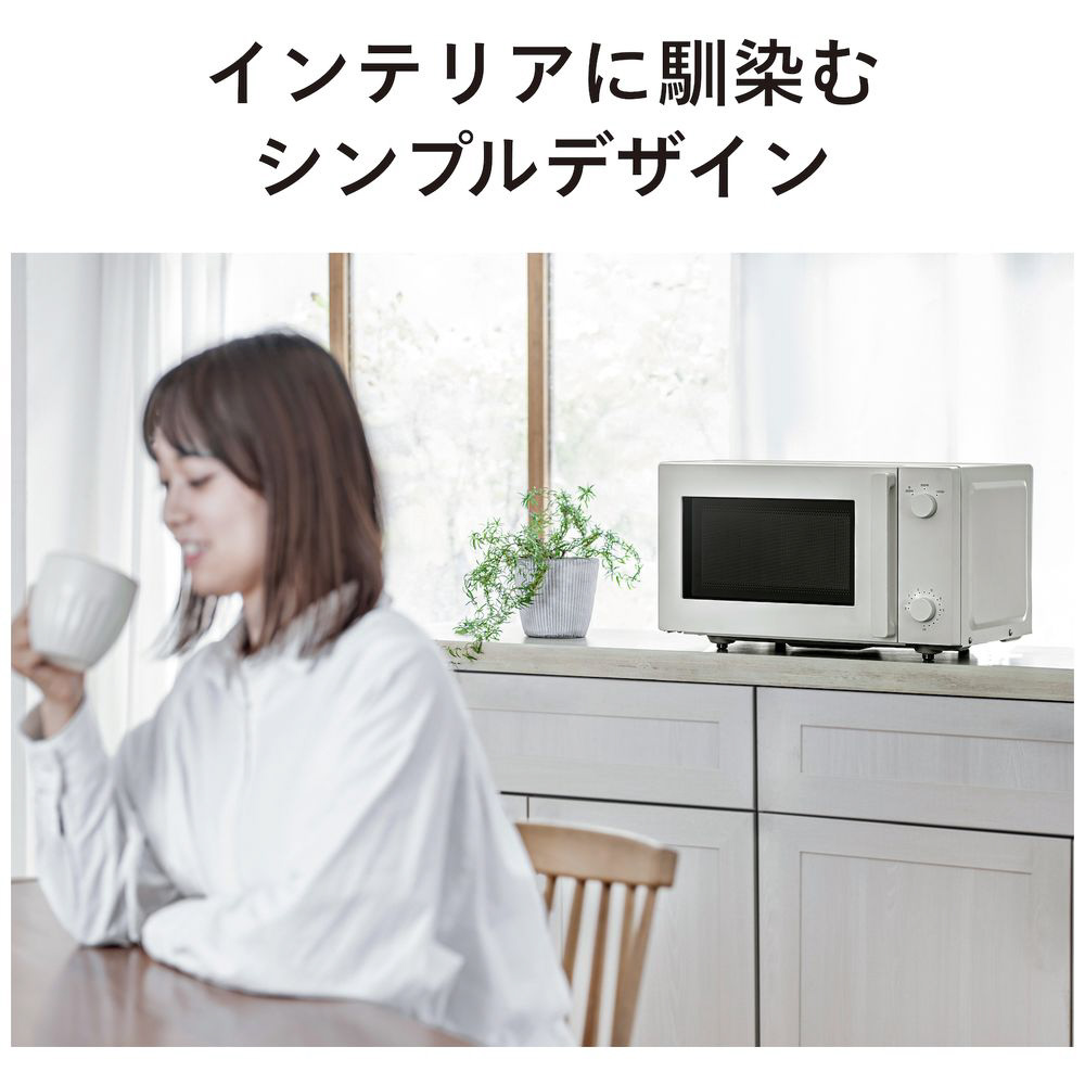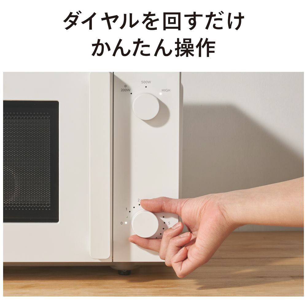 一人暮らしにぴったりな単機能電子レンジ。見た目のノイズが少なく無駄のないミニマルなデザインで、インテリアに調和します。初めてでも直感的に使えるよう、操作は3段階の出力と最大10分タイマーの2ダイヤル式。また、ターンテーブルのないフラットタイプの庫内で、大きな容器に入った冷凍食品やお弁当でも庫内に引っかかることなく楽々と出し入れすることができます。