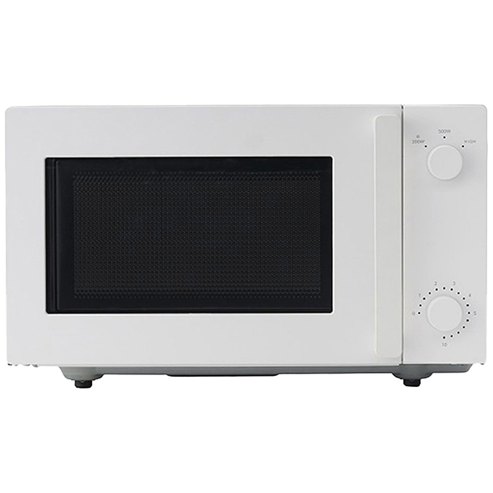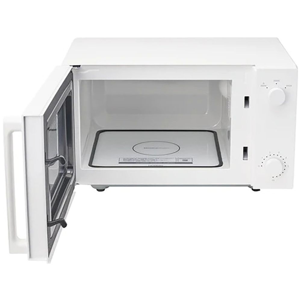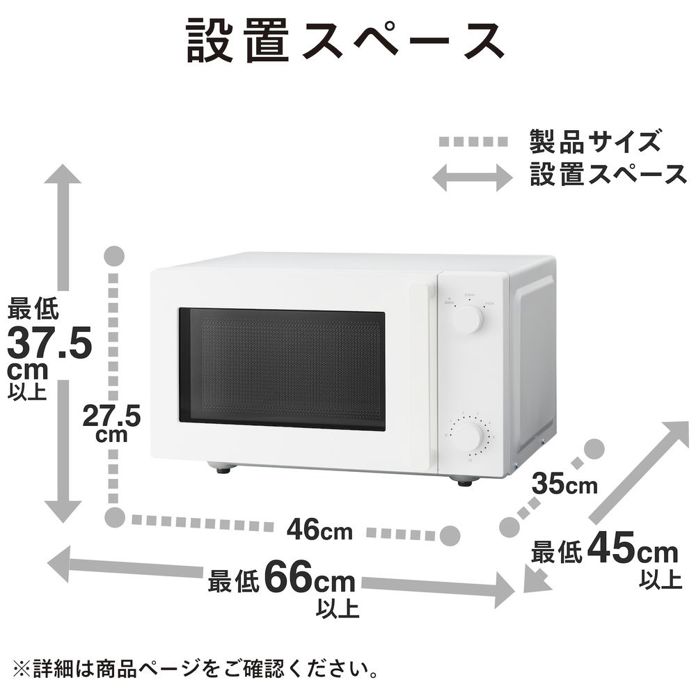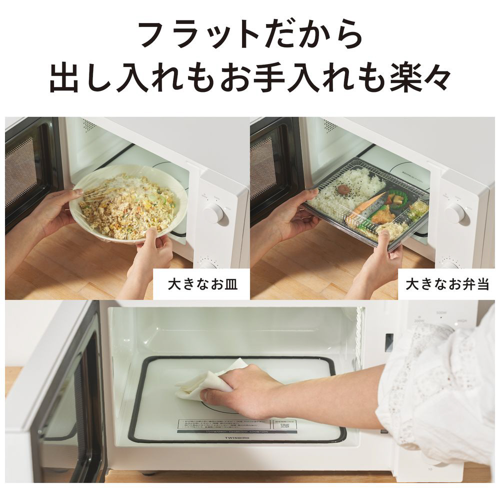 一人暮らしにぴったりな単機能電子レンジ。見た目のノイズが少なく無駄のないミニマルなデザインで、インテリアに調和します。初めてでも直感的に使えるよう、操作は3段階の出力と最大10分タイマーの2ダイヤル式。また、ターンテーブルのないフラットタイプの庫内で、大きな容器に入った冷凍食品やお弁当でも庫内に引っかかることなく楽々と出し入れすることができます。