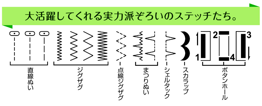 ダイヤルを合わせるだけで、ジグザグ、まつりぬい、点線ジグザグ、ボタンホールなどがぬえます。