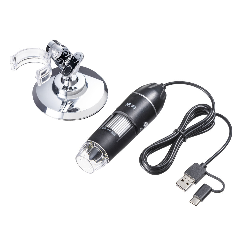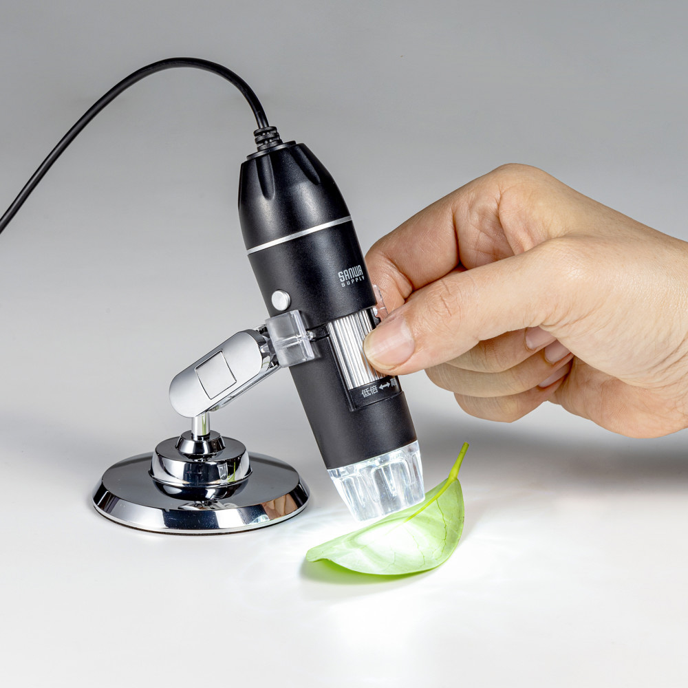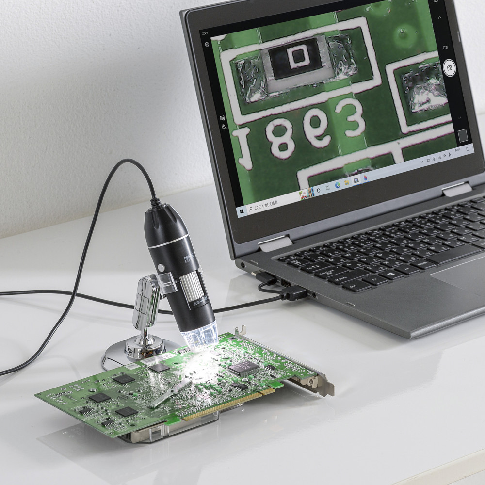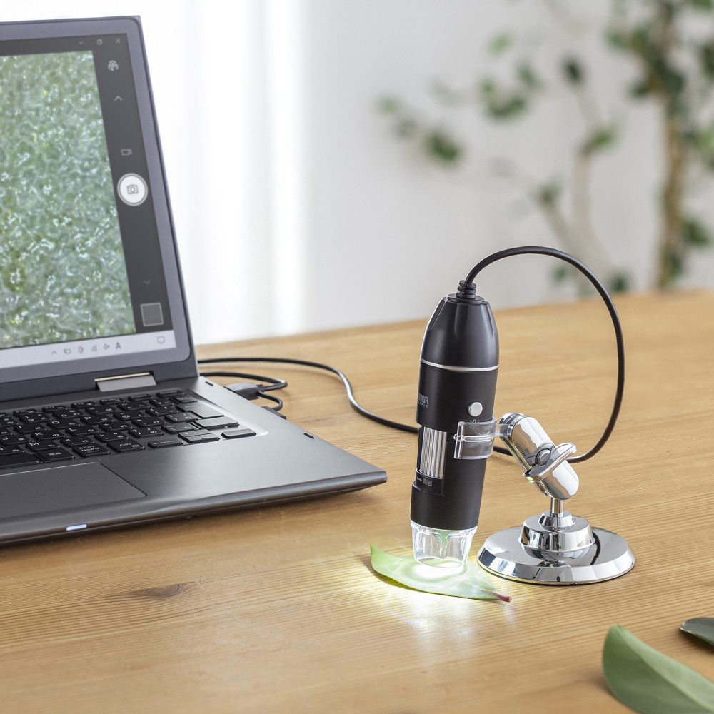 最大300倍まで拡大できるフルHD対応USB顕微鏡、プリント基板や印刷物の確認に。STEAM教育や夏休みの自由研究に最適。専用スタンドを付属。