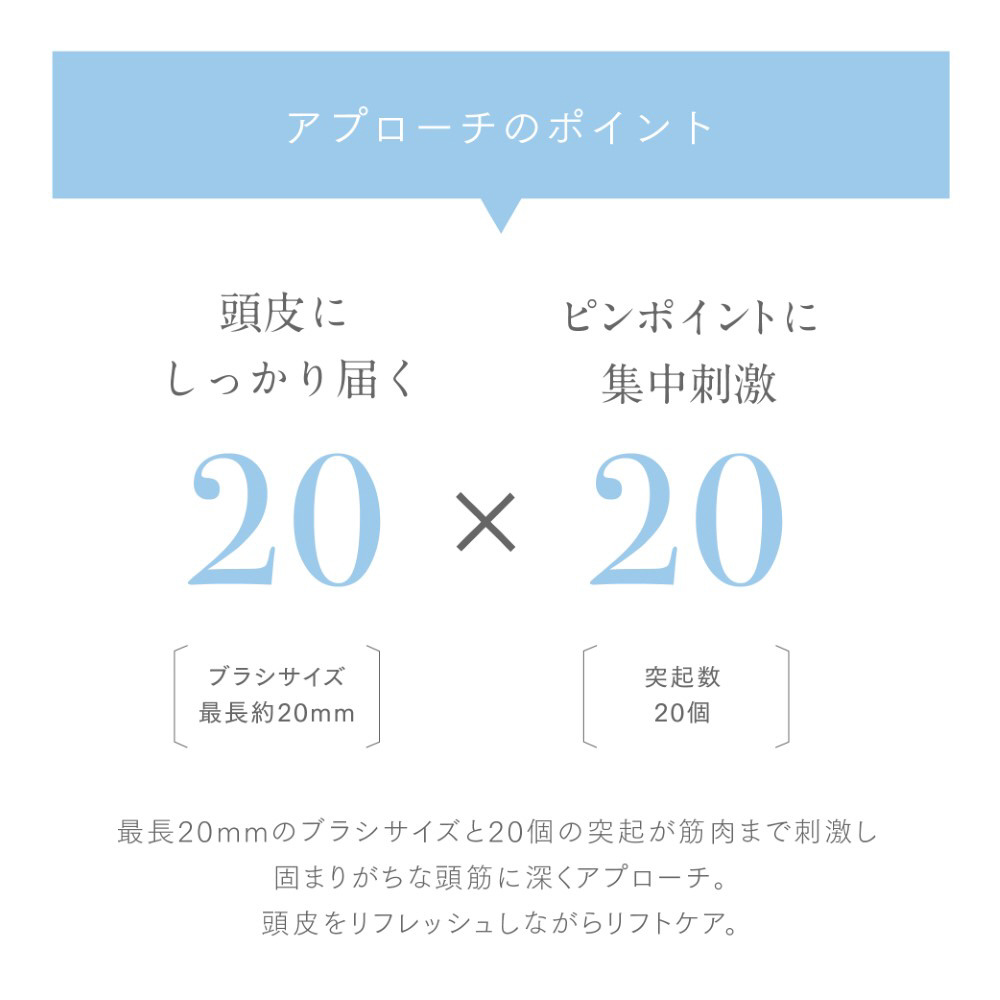 最長20mmのブラシサイズと20個の突起が筋肉まで刺激し、固まりがちな頭筋に深くアプローチ。
