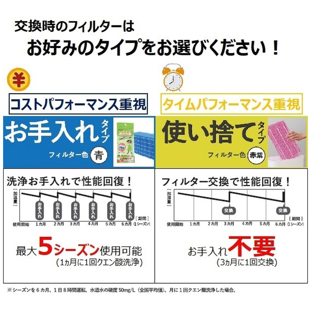 | フィルター交換目安 | 抗菌気化フィルター 5シーズン、カンタン取替えフィルター 3カ月、Ag+抗菌アタッチメント 1シーズン、カンタン取替えトレイカバー 1シーズン |