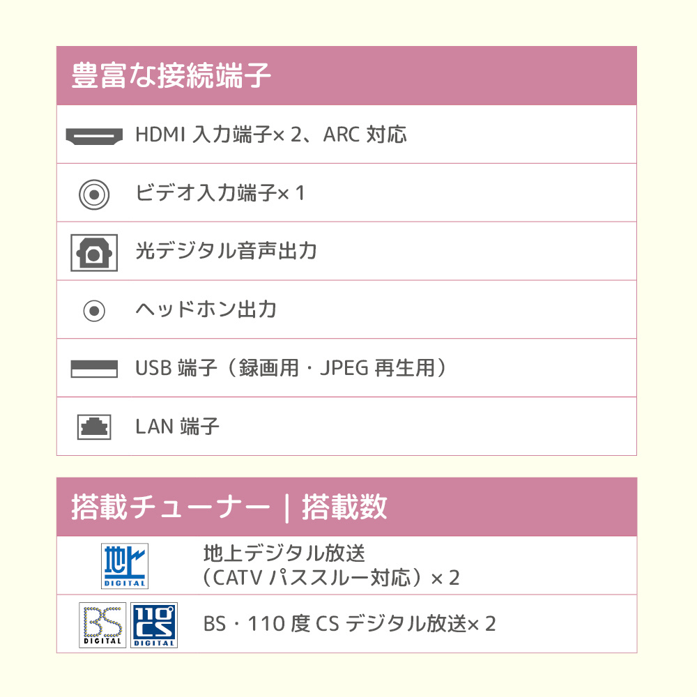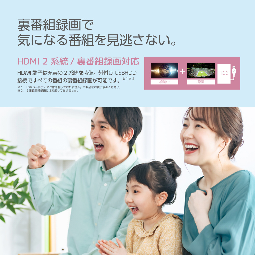 地デジ、BS/CSチューナー搭載 (各2基搭載) の3波モデル「キレイ・かんたん・使いやすい ウラ録対応デキるテレビ」