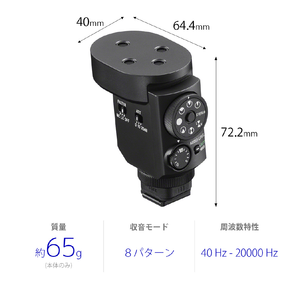 | 仕様3 | チャンネル音声出力:アナログ 2ch / デジタル 4ch シュー形状:マルチインターフェースシュー 形式:バックエレクトレットコンデンサー型 周波数特性:40Hz - 20000Hz |