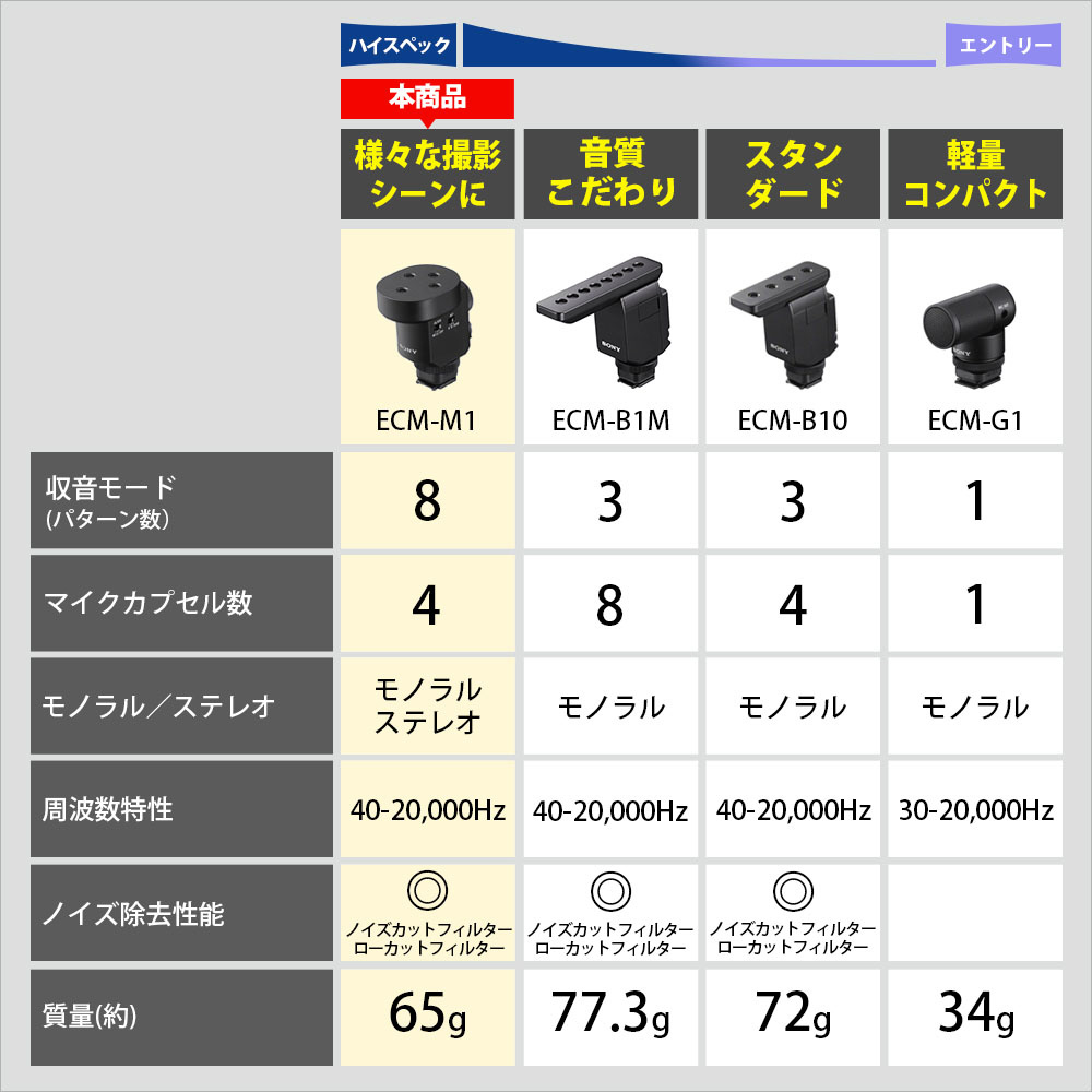 技術により、従来のショットガンマイクの常識を覆す、世界初*の8つの収音モードを搭載。直感的なダイヤル操作で収音モードを切り換えできる、使い勝手のいい小型・高音質マイクです。ECM-M1は、このマイク1つで映像収録時にあらゆるシチュエーションにおいて、簡単かつ最適な音声収録を可能にします。