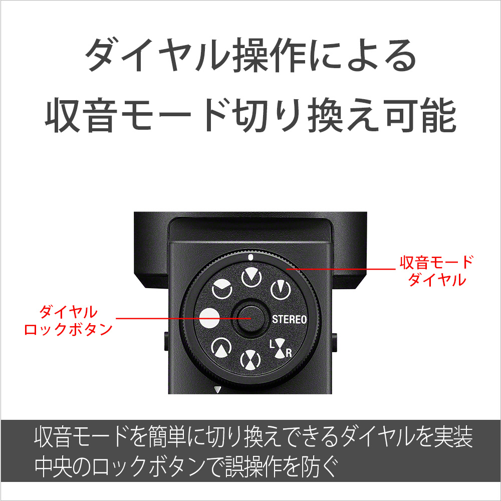 世界初(*)の8つの収音モードを搭載し、直感的なダイヤル操作で切り換え可能な、使い勝手のいい小型・高音質マイクです。手元で手軽に切り換えられる「収音モードダイヤル」も搭載しています。