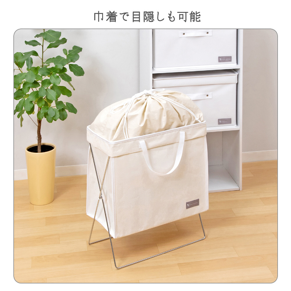 【2WAY洗濯バッグ】:ワイヤーで口を大きく開いて収納でき、バッグを外せば持ち運びにも便利。コインランドリーに持っていくにも重宝します。巾着型なので中身が見えないのもGood。